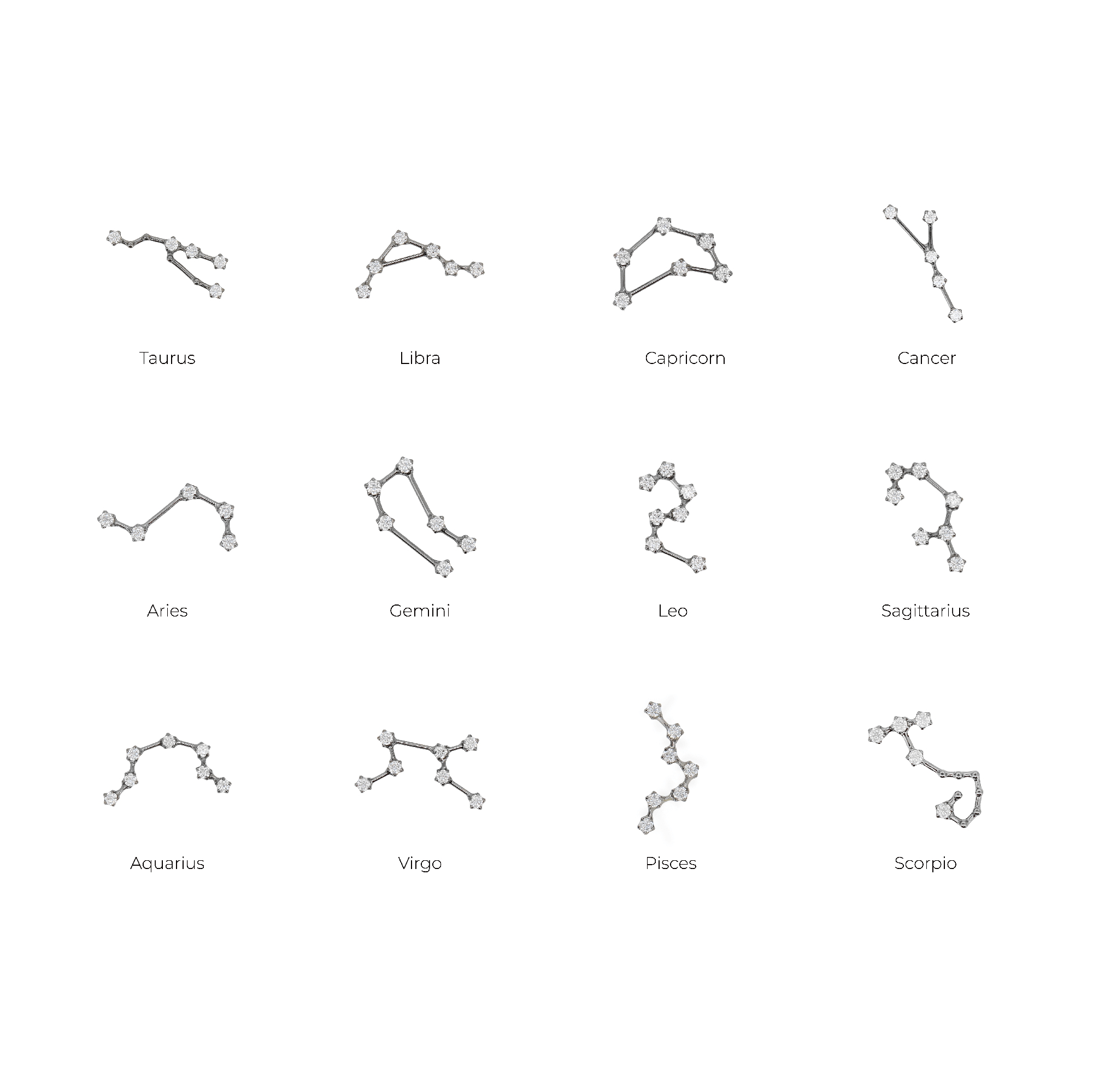 Gioielli a forma di costellazioni zodiacali, impreziositi da punti luce in zircone che richiamano le stelle nel cielo. Un design delicato e simbolico, pensato per portare con sé l’energia del proprio segno.