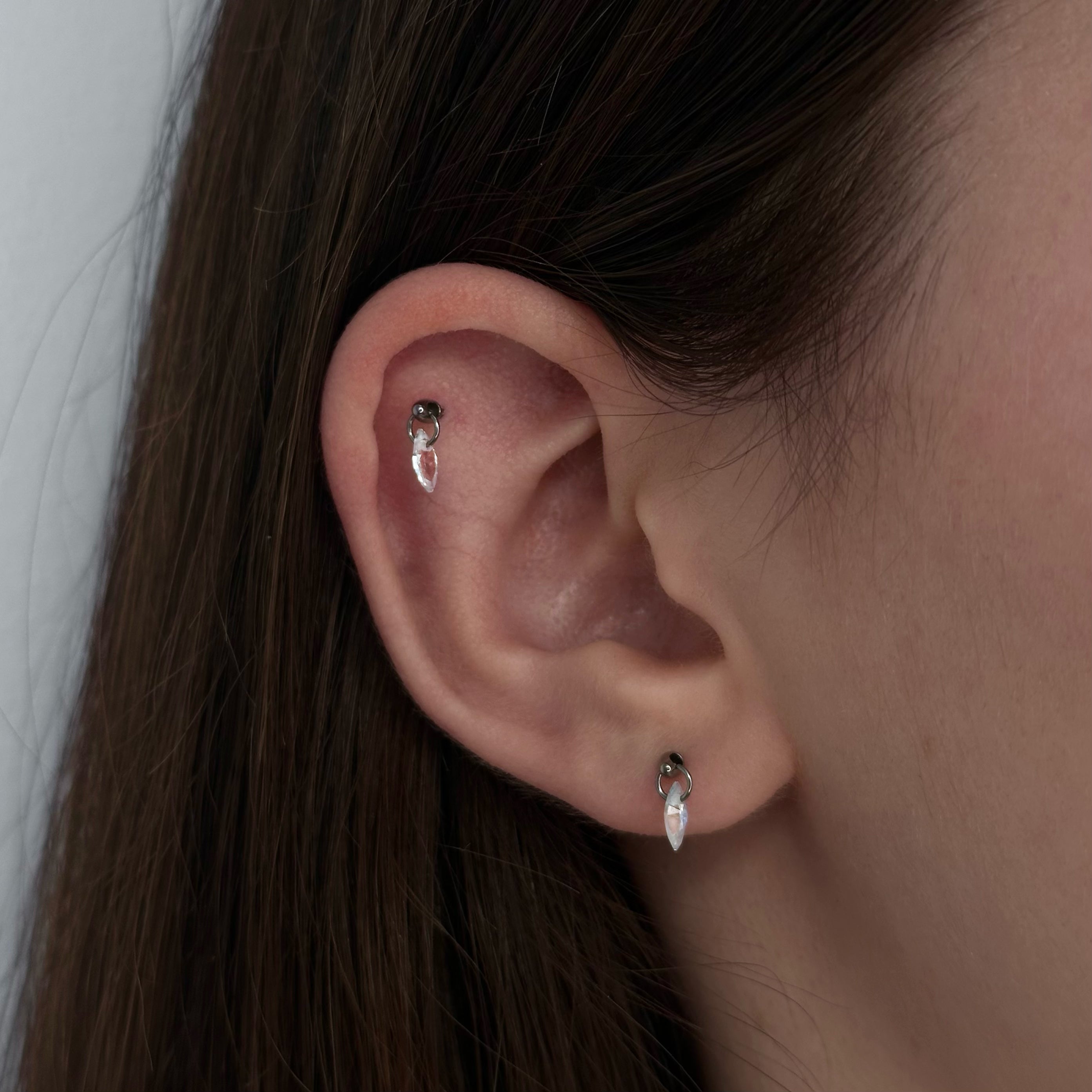 Ludovica indossa Baby nella variante Marquise aurora boreale su flat e nella variante Marquise cristallo su primo lobo.
