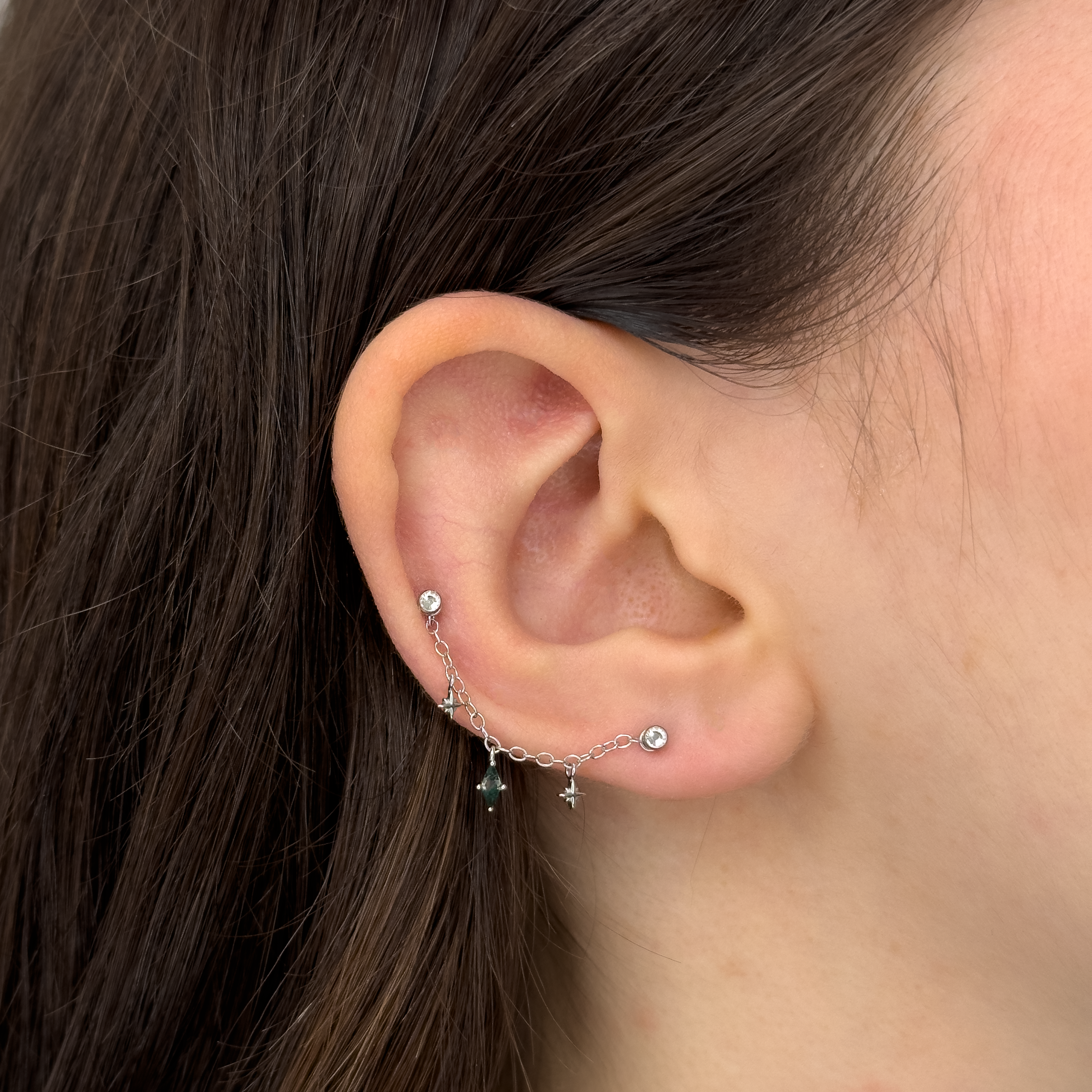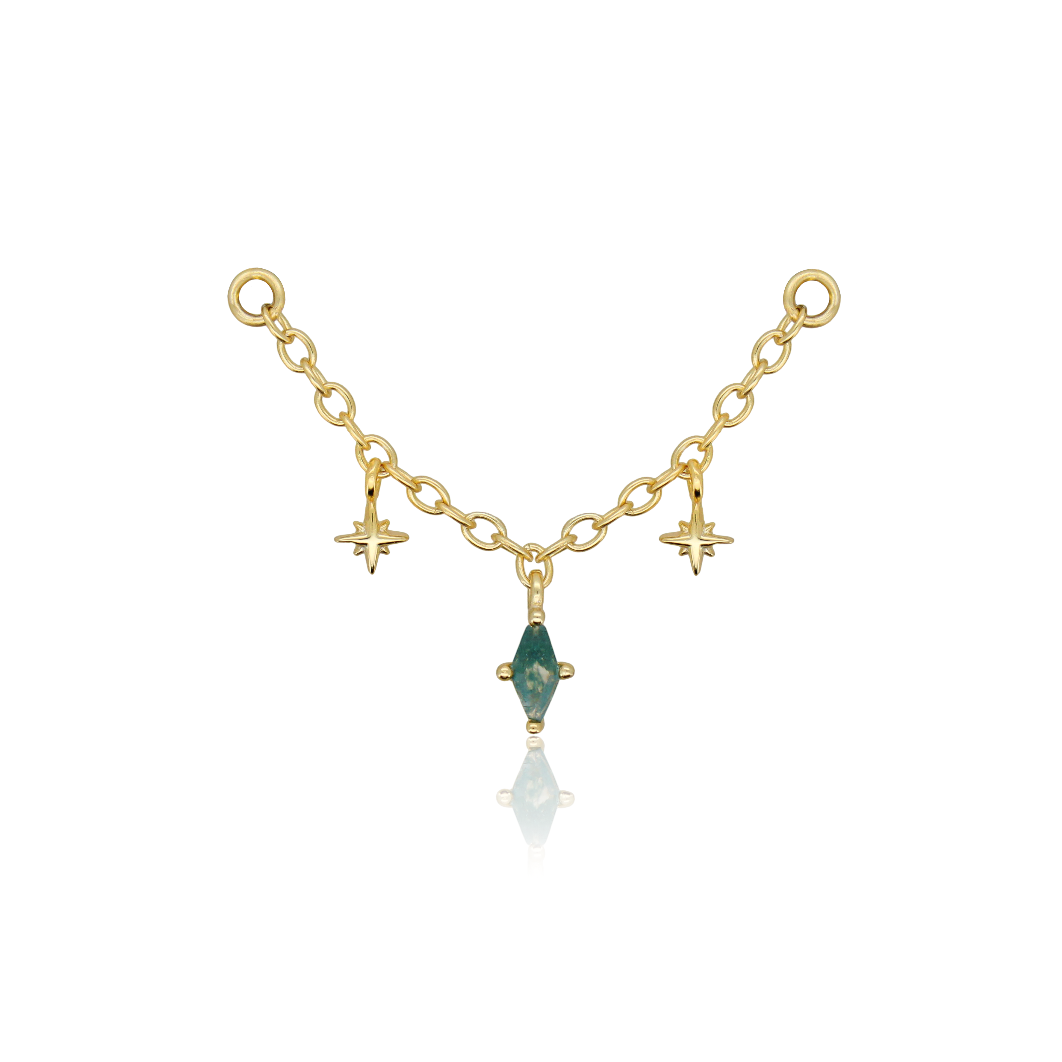 Chain con due stelline e un rombo con pietra verde pendente adatta a due fori in Argento 925 e Argento 925 placcato oro 18kt.