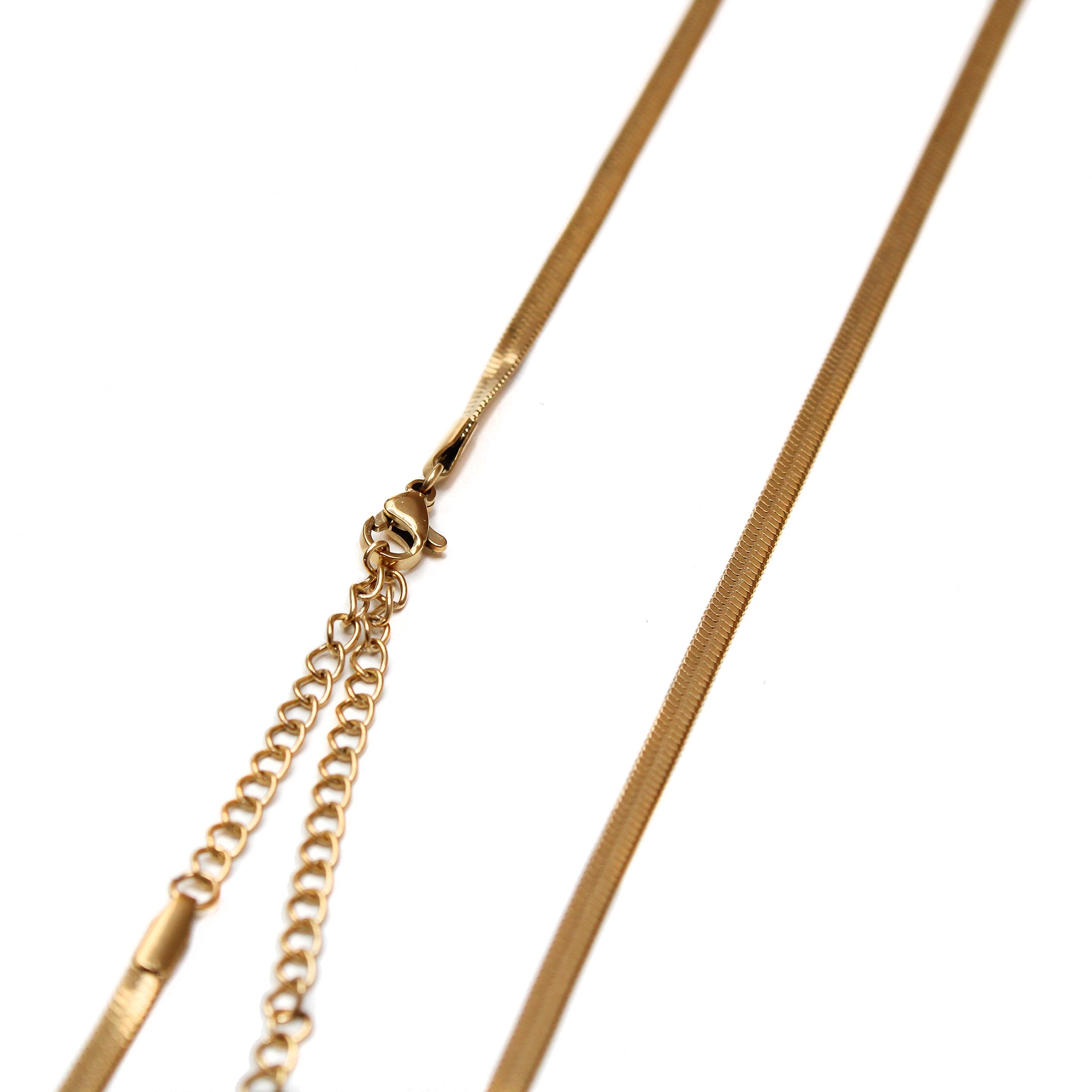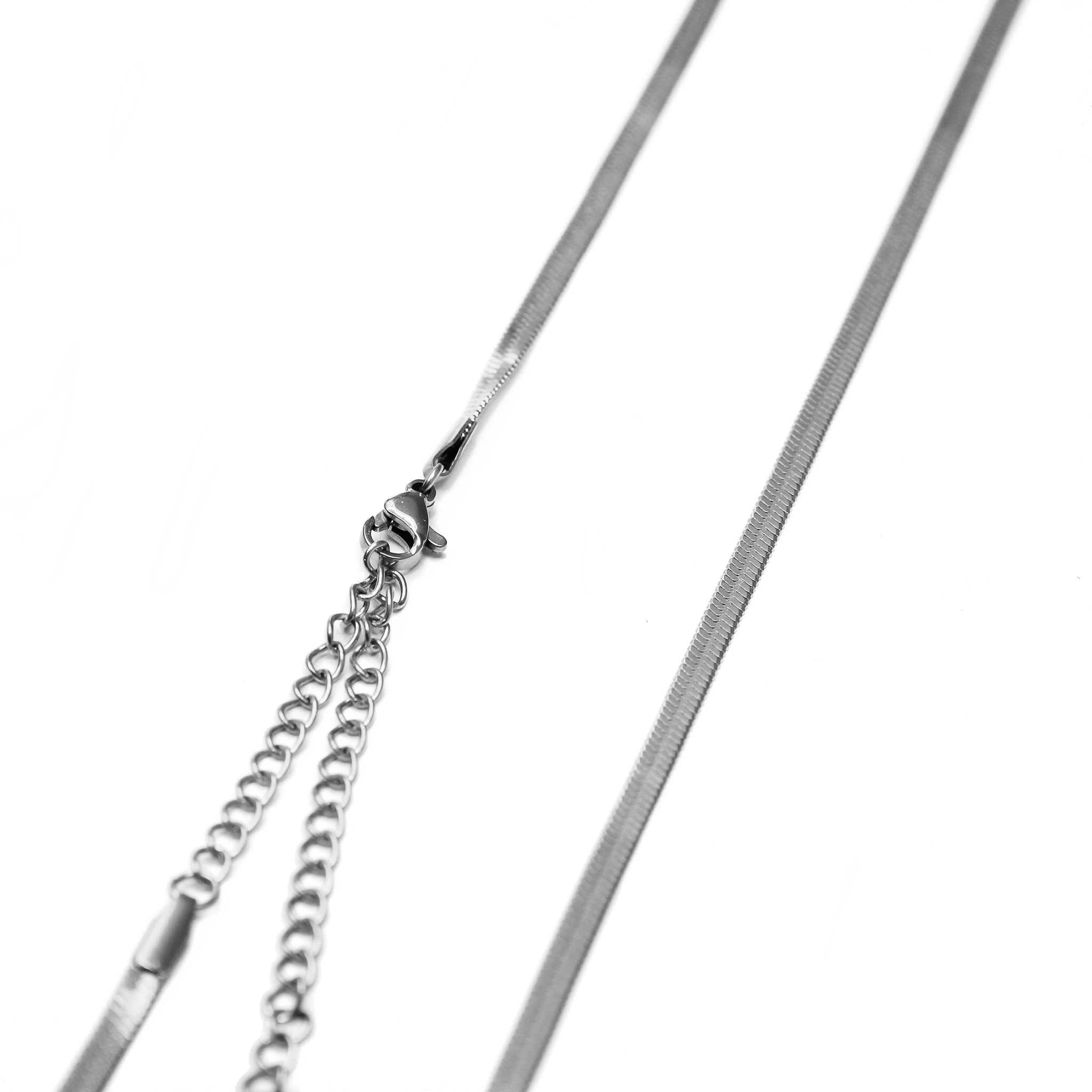 Catena in acciaio 316L con maglia a "spina di pesce". La sua struttura piatta e flessibile crea riflessi sinuosi simili a squame di serpente, per un effetto delicato ma deciso.