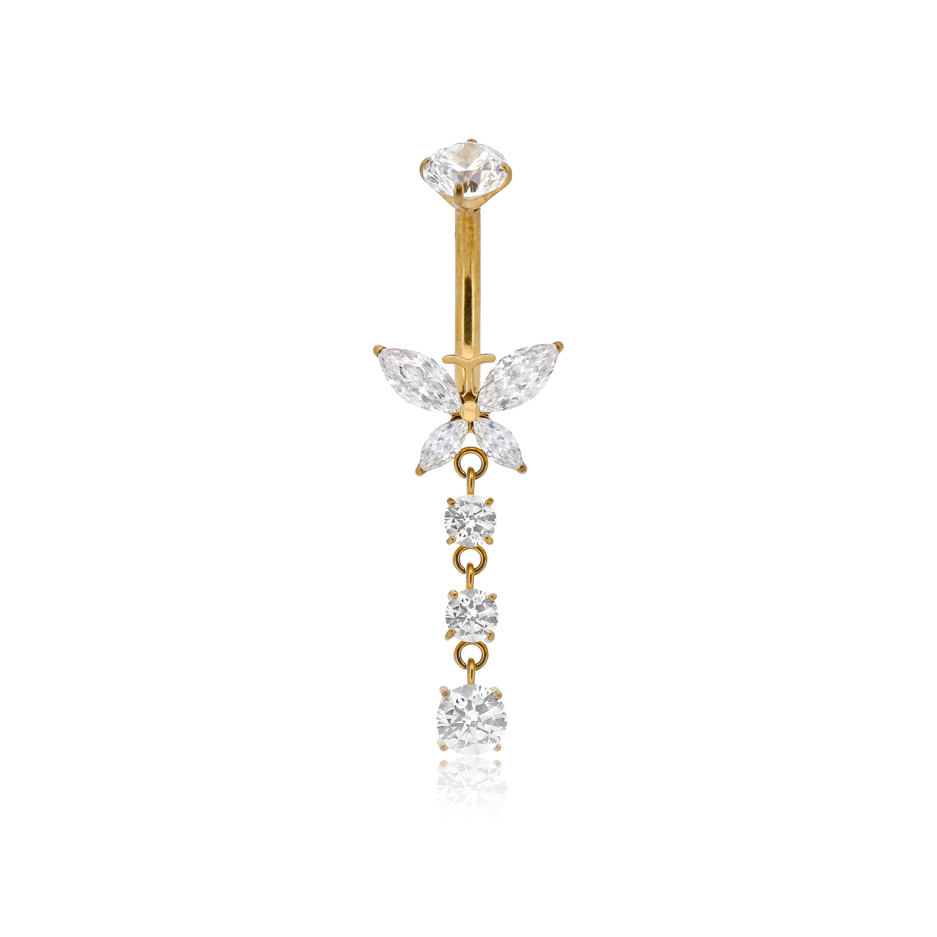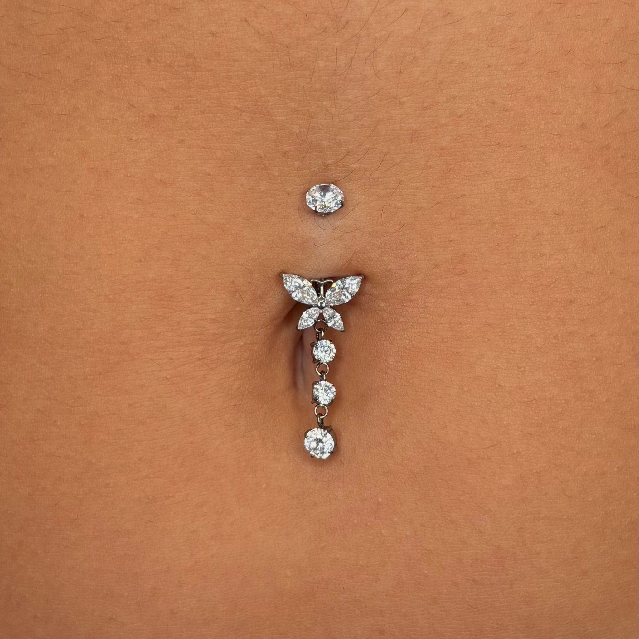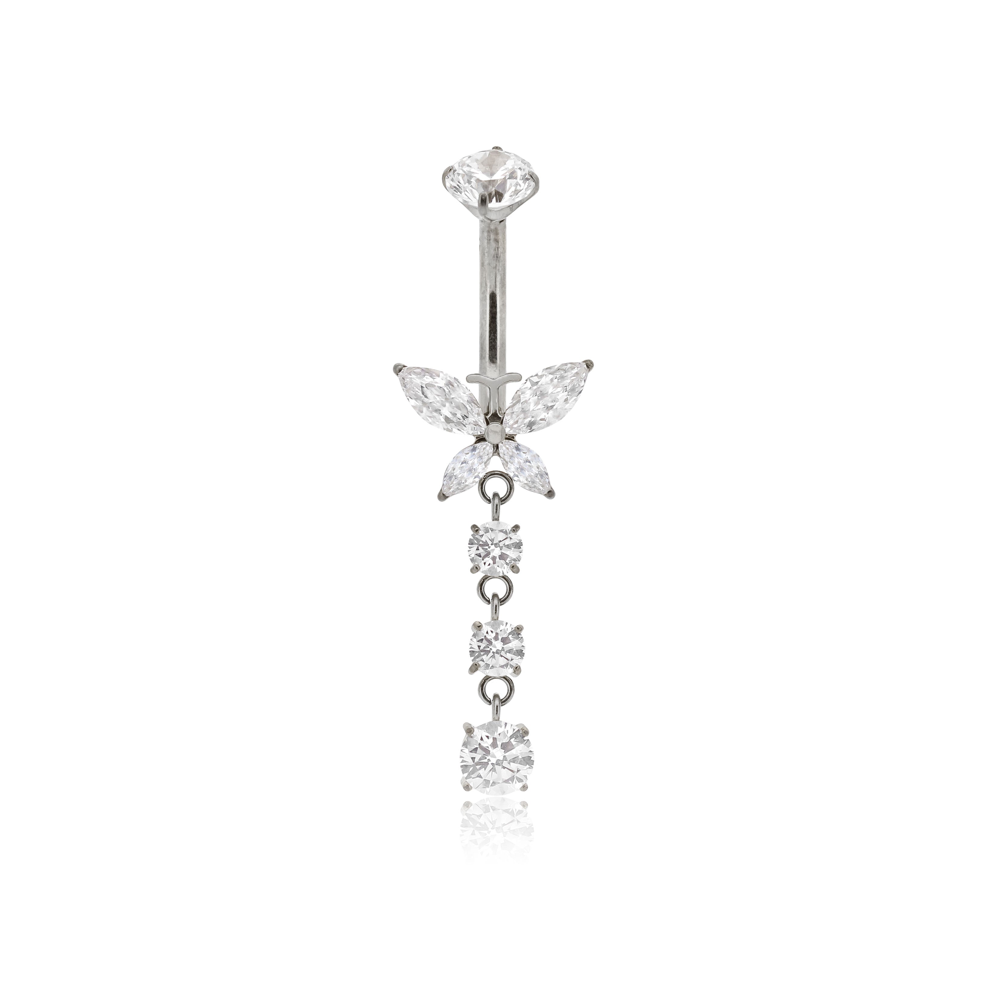 Gioiello per ombelico con zircone sopra, farfalla cristallo e 3 gemme pendenti cristallo.