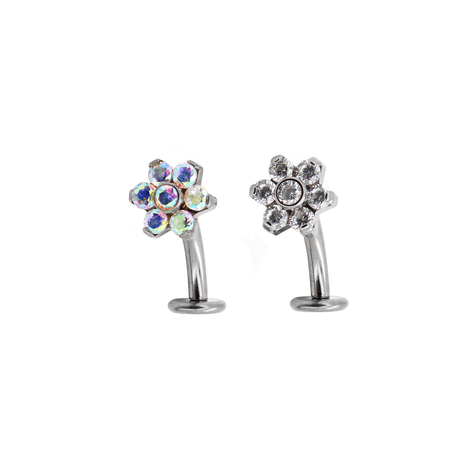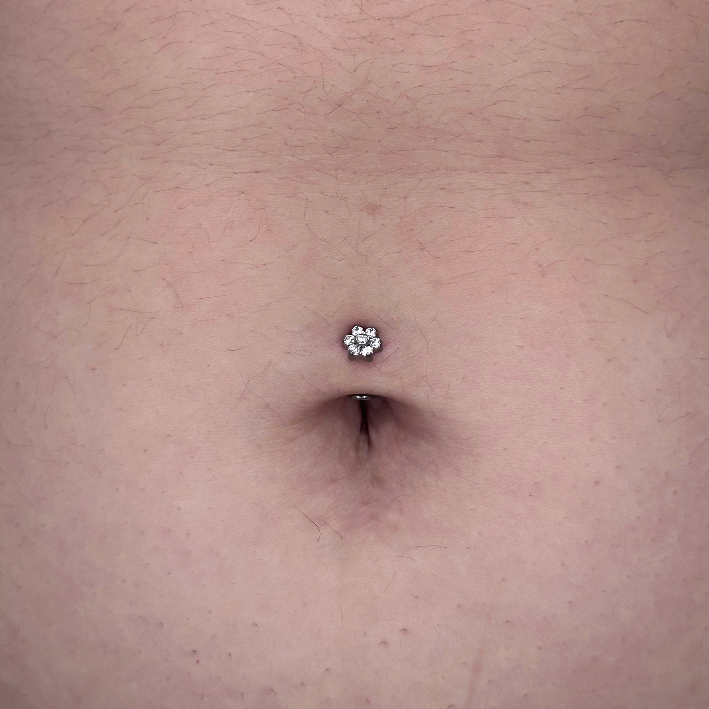 Piercing per floating navel con fiore con cristalli bianchi o aurora boreale.