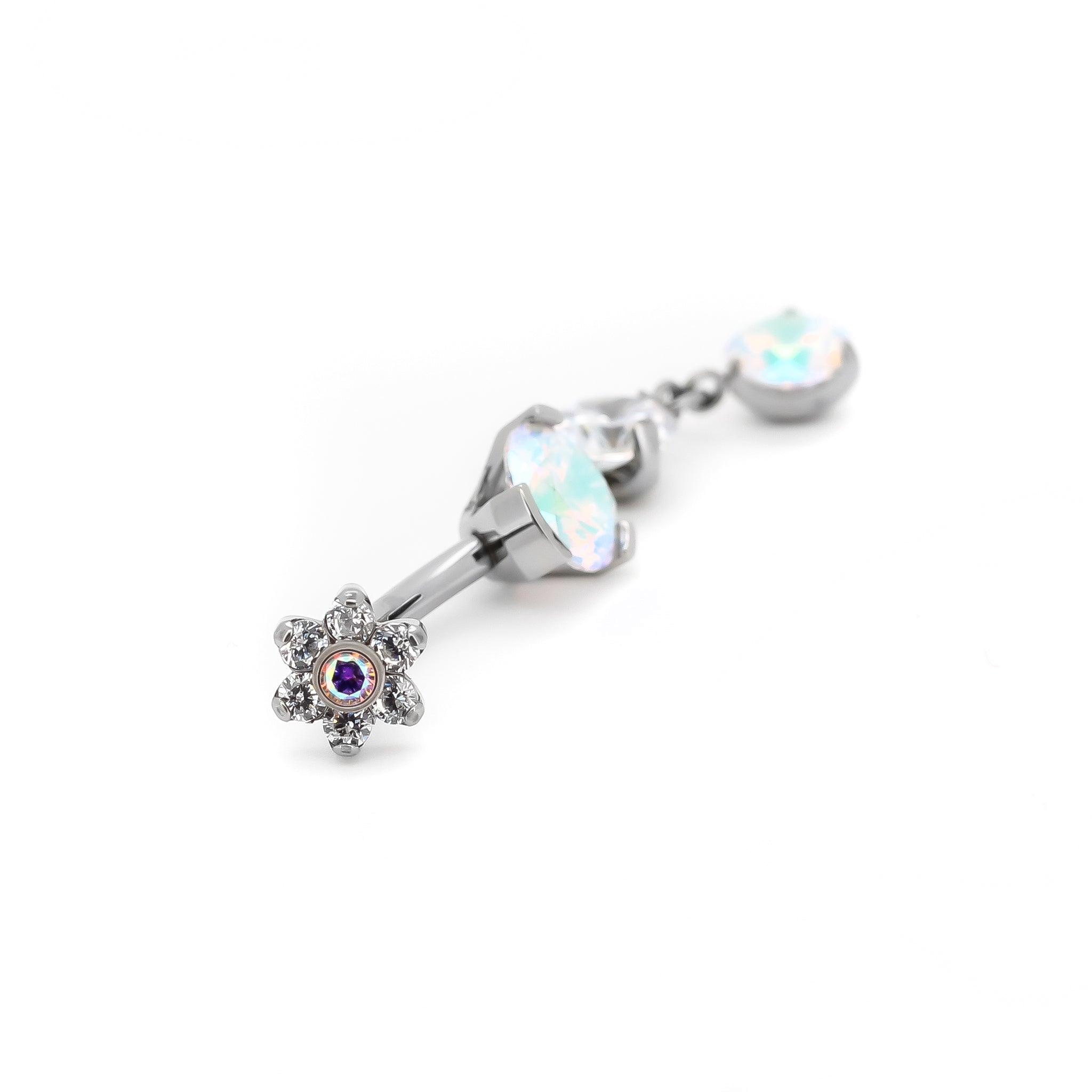 Gioiello con top a forma di fiore e 3 cristalli pendenti di colore bianco e aurora boreale.