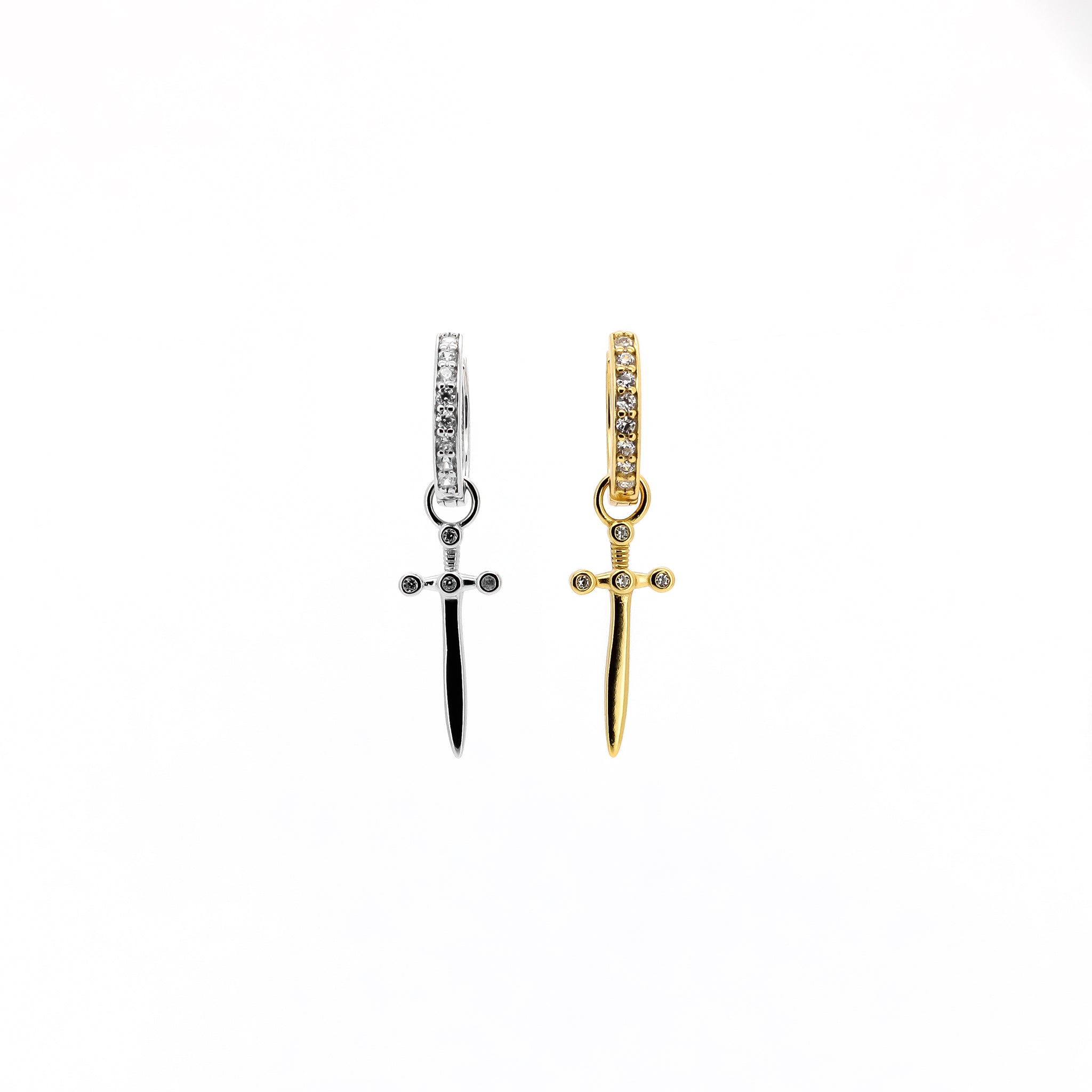 Ring adatto a lobo, con decorazione laterale formata da zirconi e charm a forma di spada.