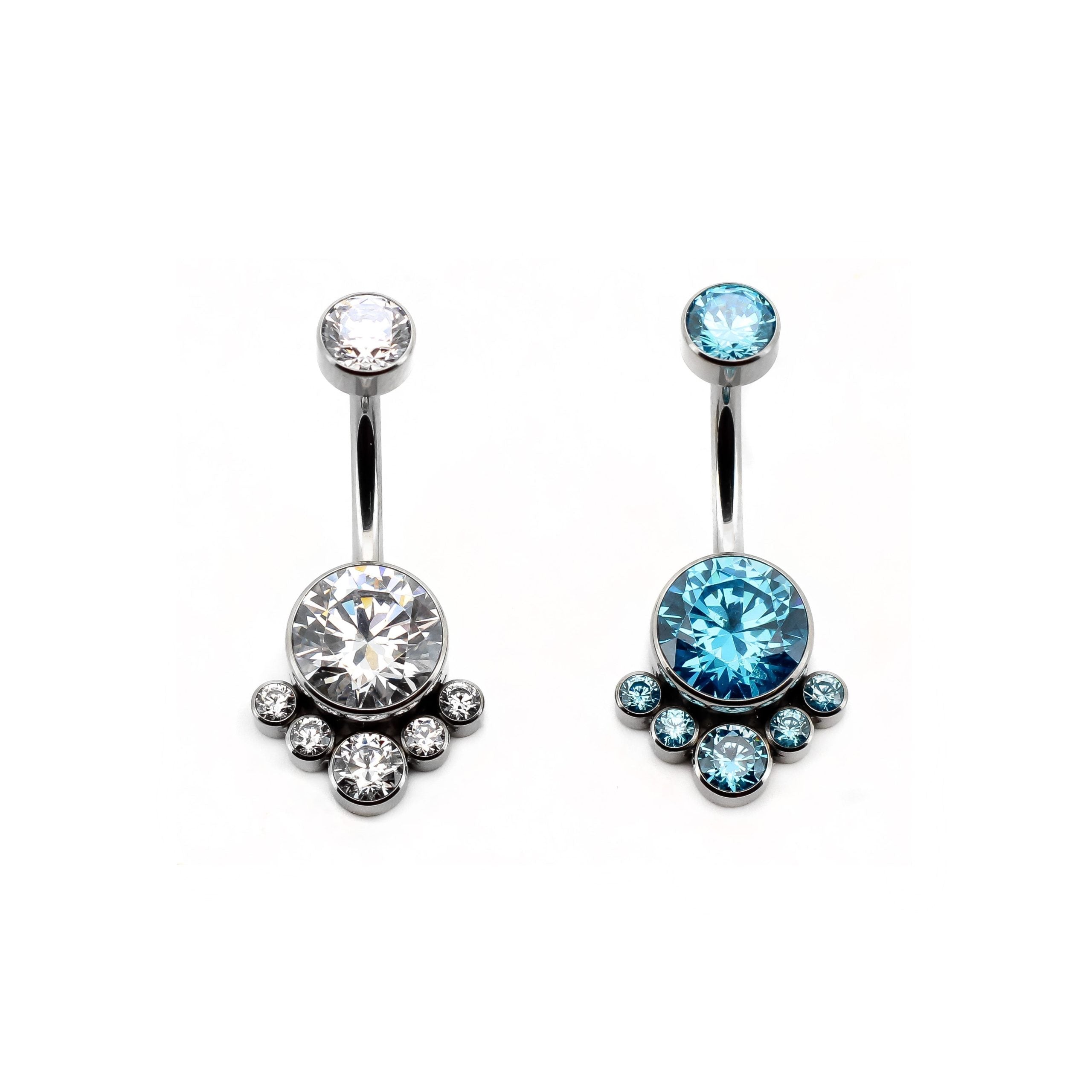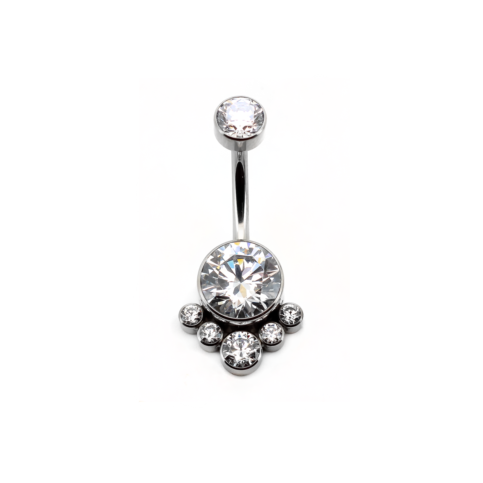 Gioiello per ombelico, con un cristallo centrale tondeggiante, circondato da cristalli.