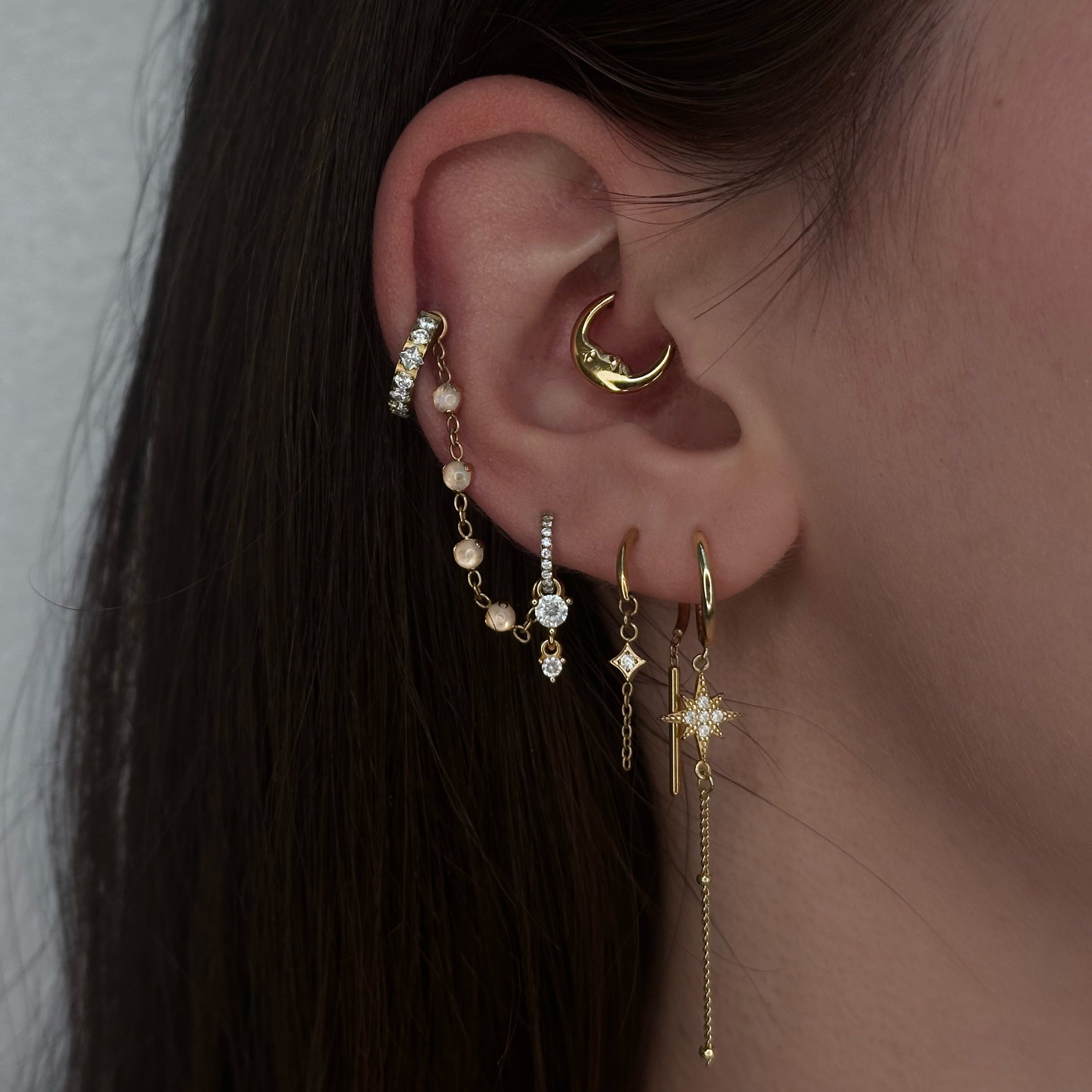 Nella composizione Roberta indossa Moonstone chain da terzo lobo ad helix in combo a Moonface clicker su daith.