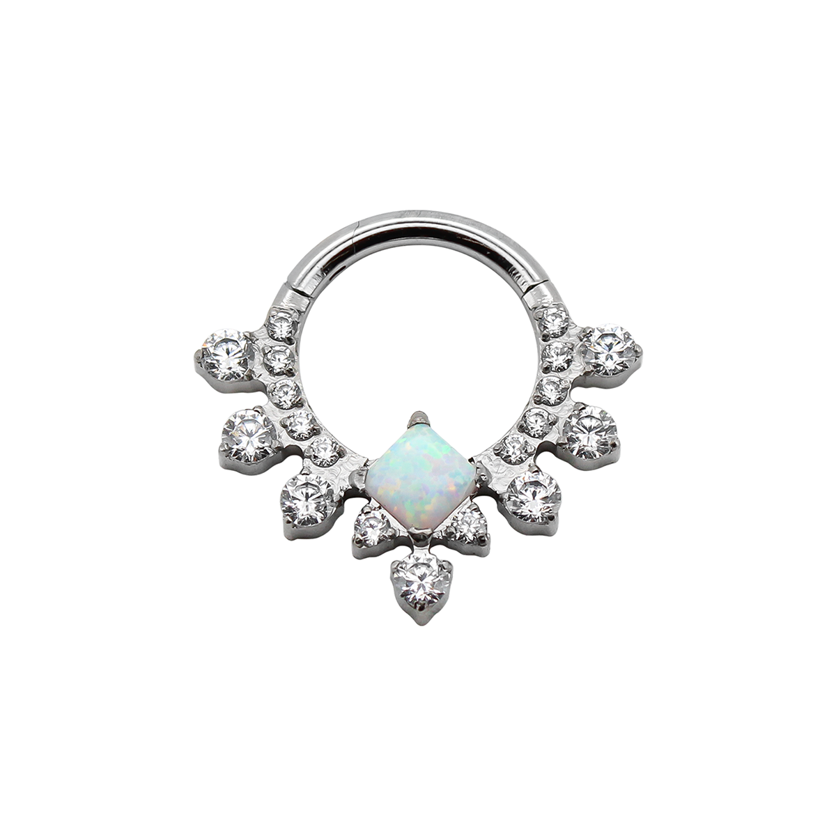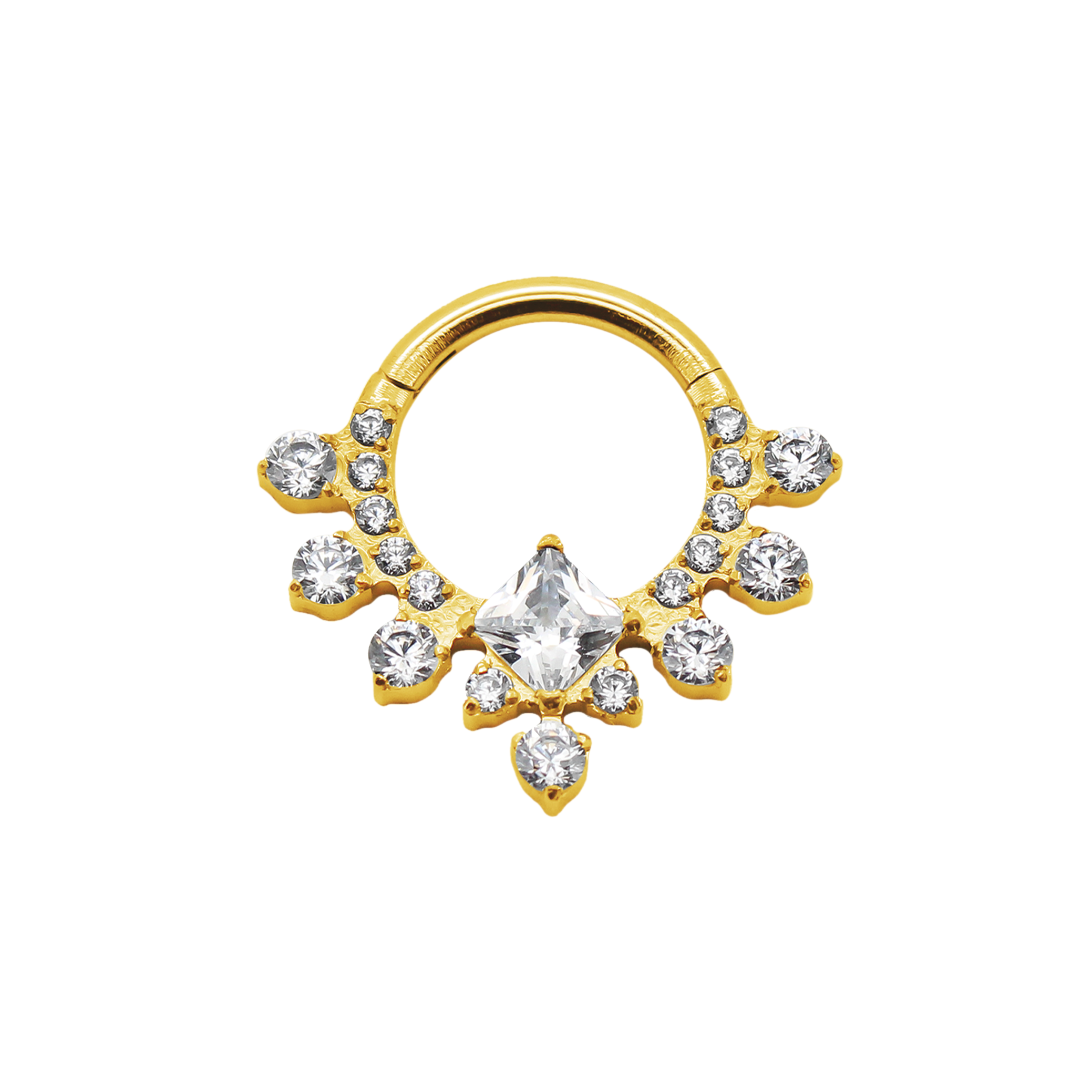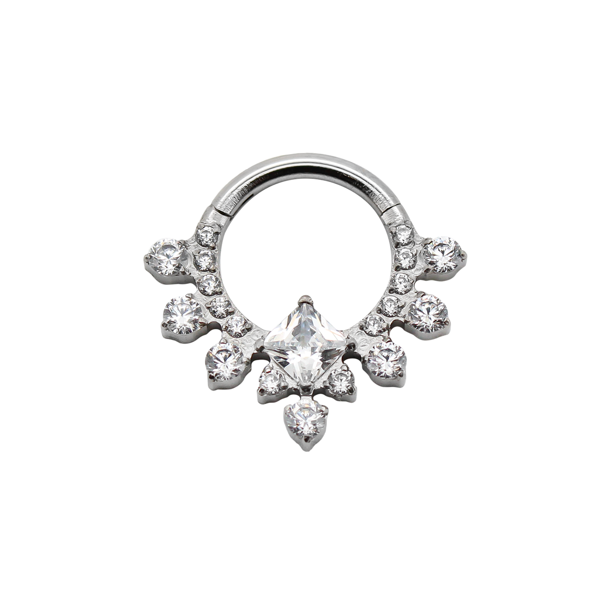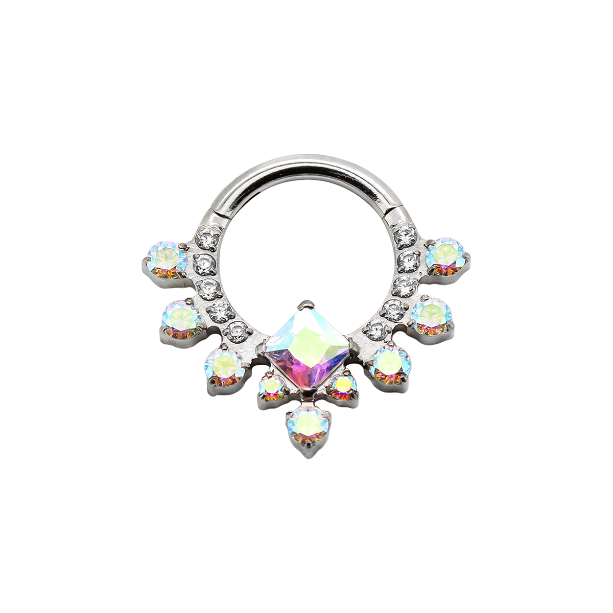 Clicker decorato frontalmente con corona di zirconi di diverse forme e dimensioni.