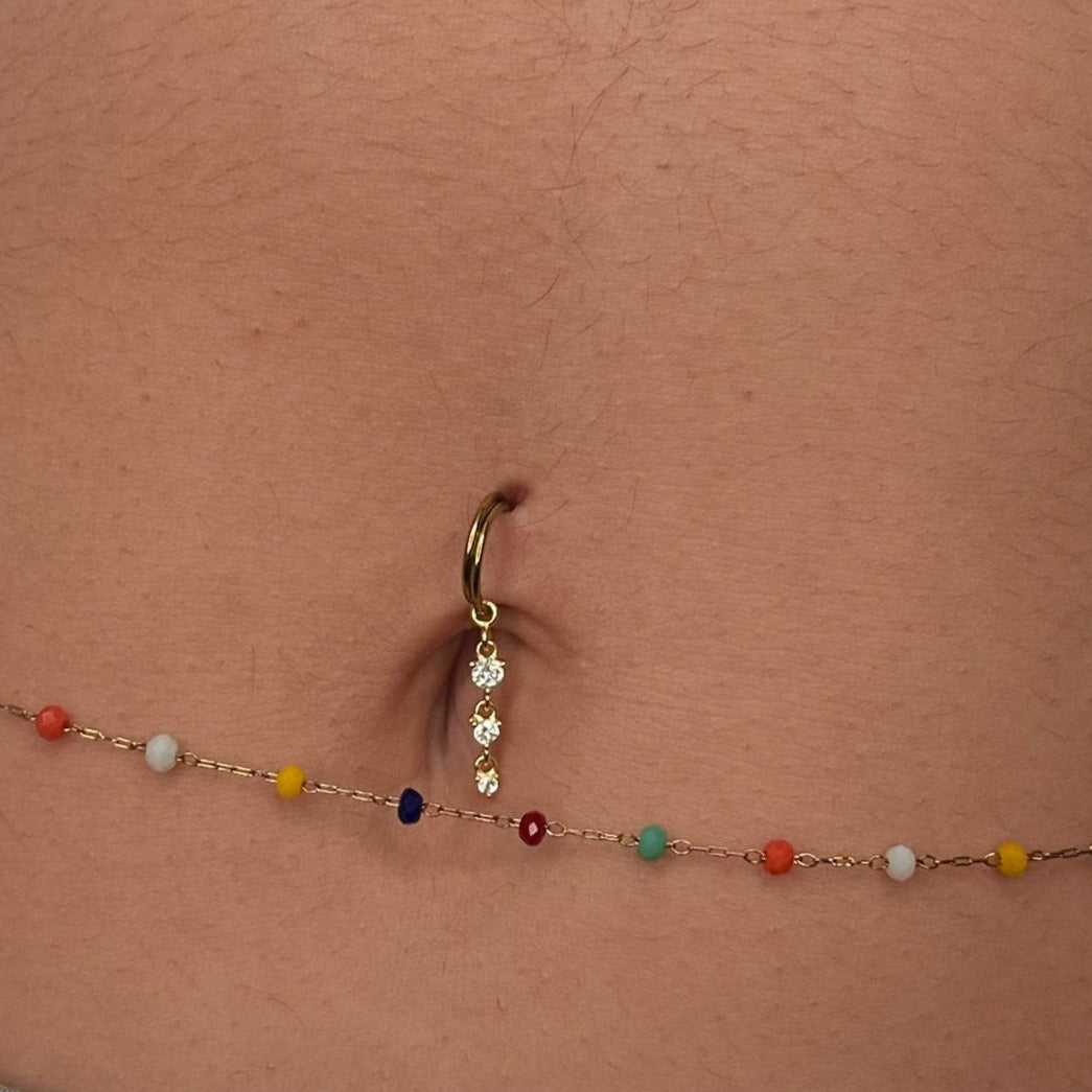 Roberta indossa il Fuji charm su ombelico con un basic clicker 0.8  e in vita la nostra belly colorful chain.