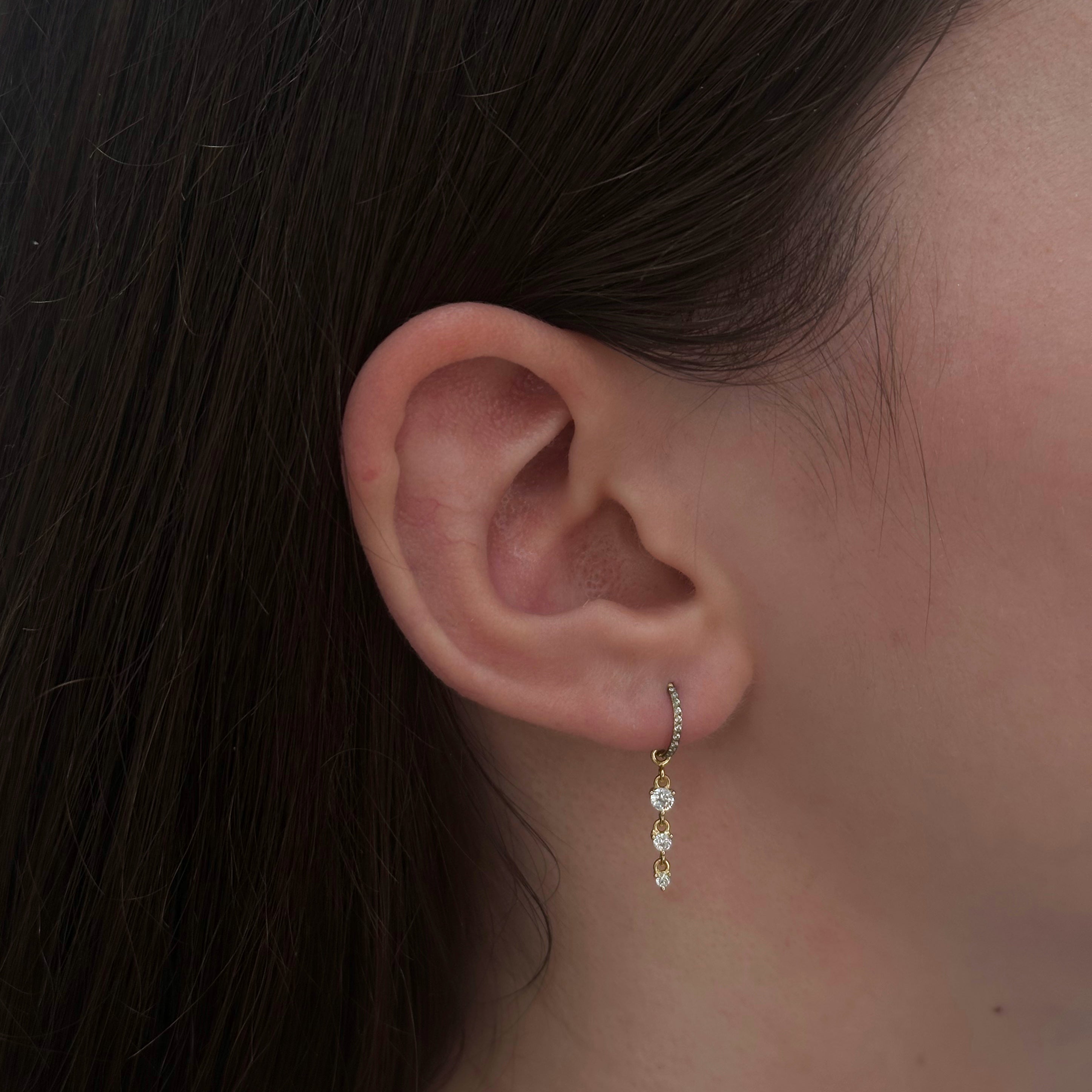 Pendente con tre zirconi in ordine decrescente con occhiello di diametro 1 mm. Adatto solo a cerchietti di spessore 1 mm o inferiore.