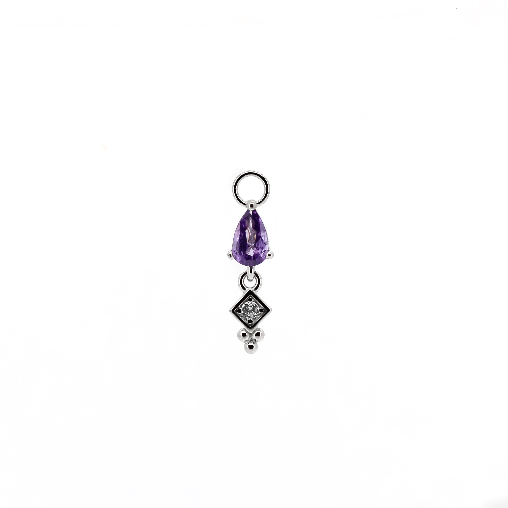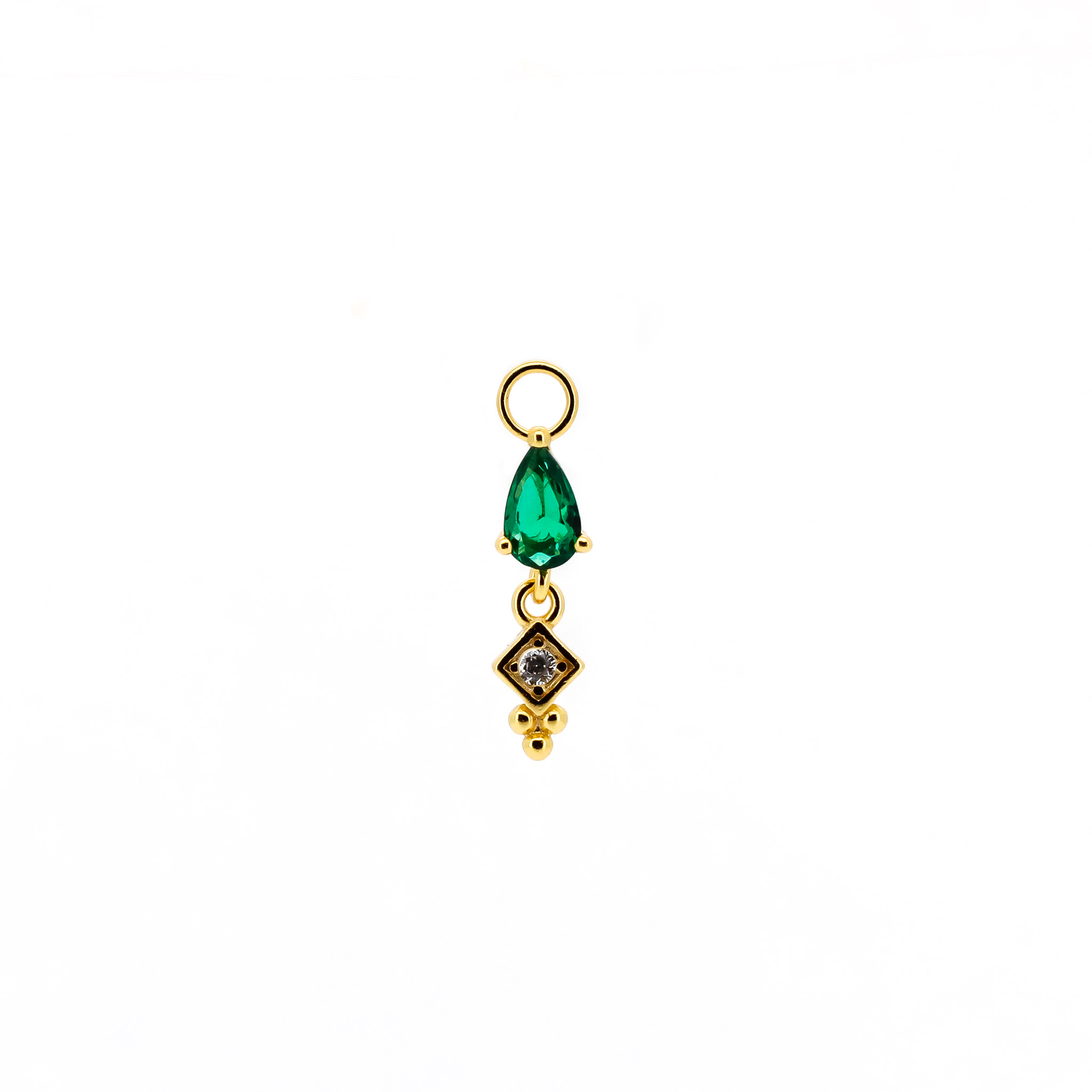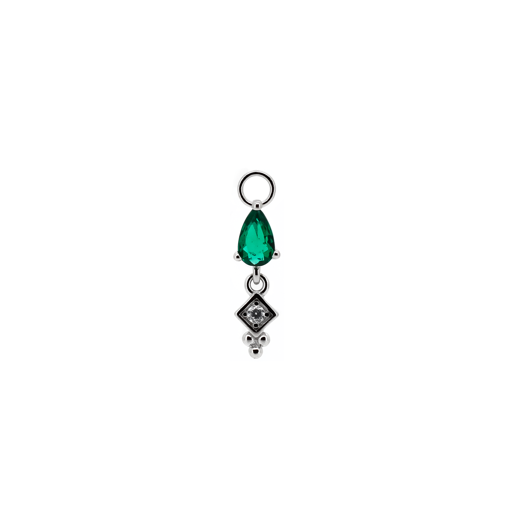 Pendente con pietra a forma di goccia colorata e zircone con occhiello di diametro 1 mm. Adatto solo a cerchietti di spessore 1 mm o inferiore.