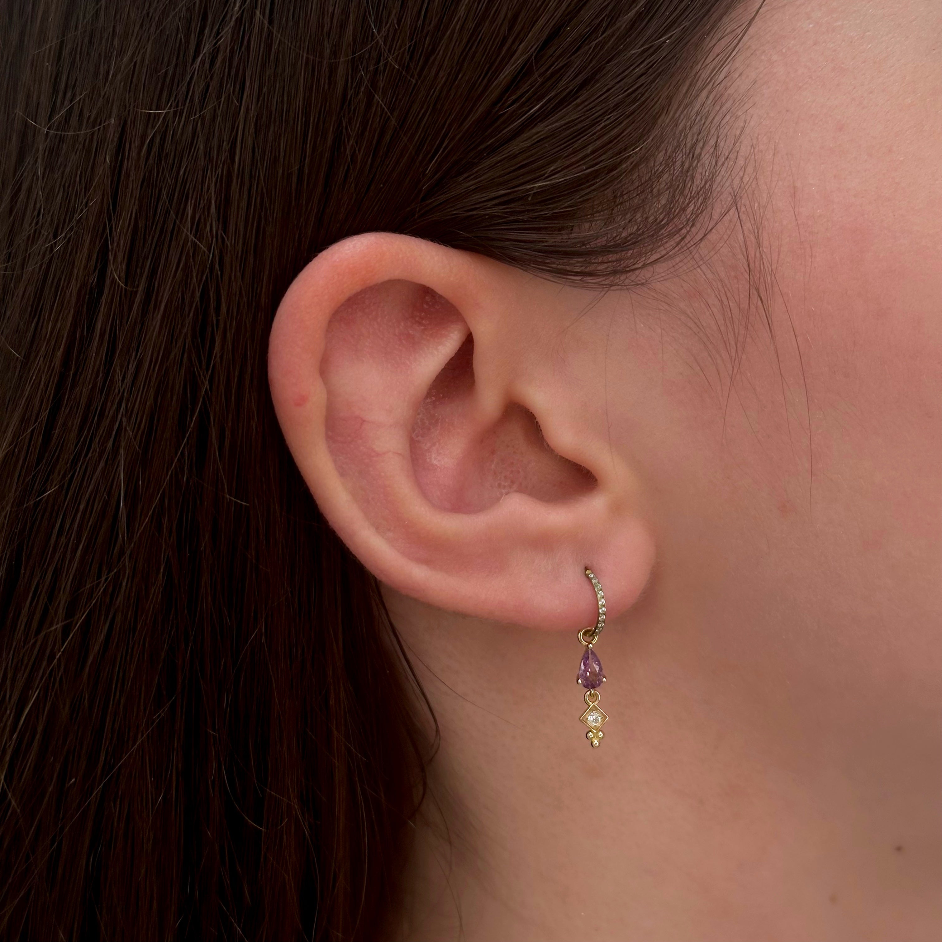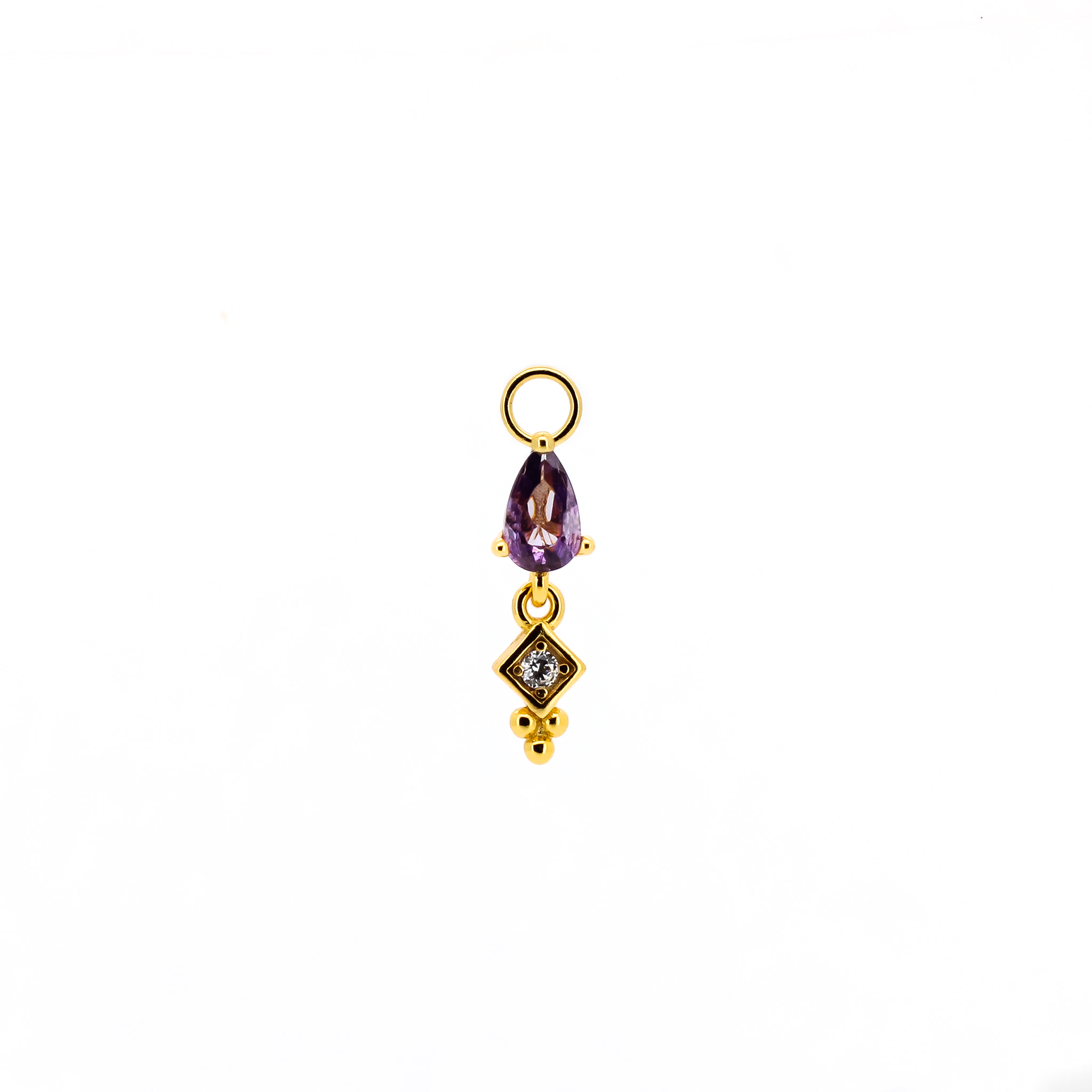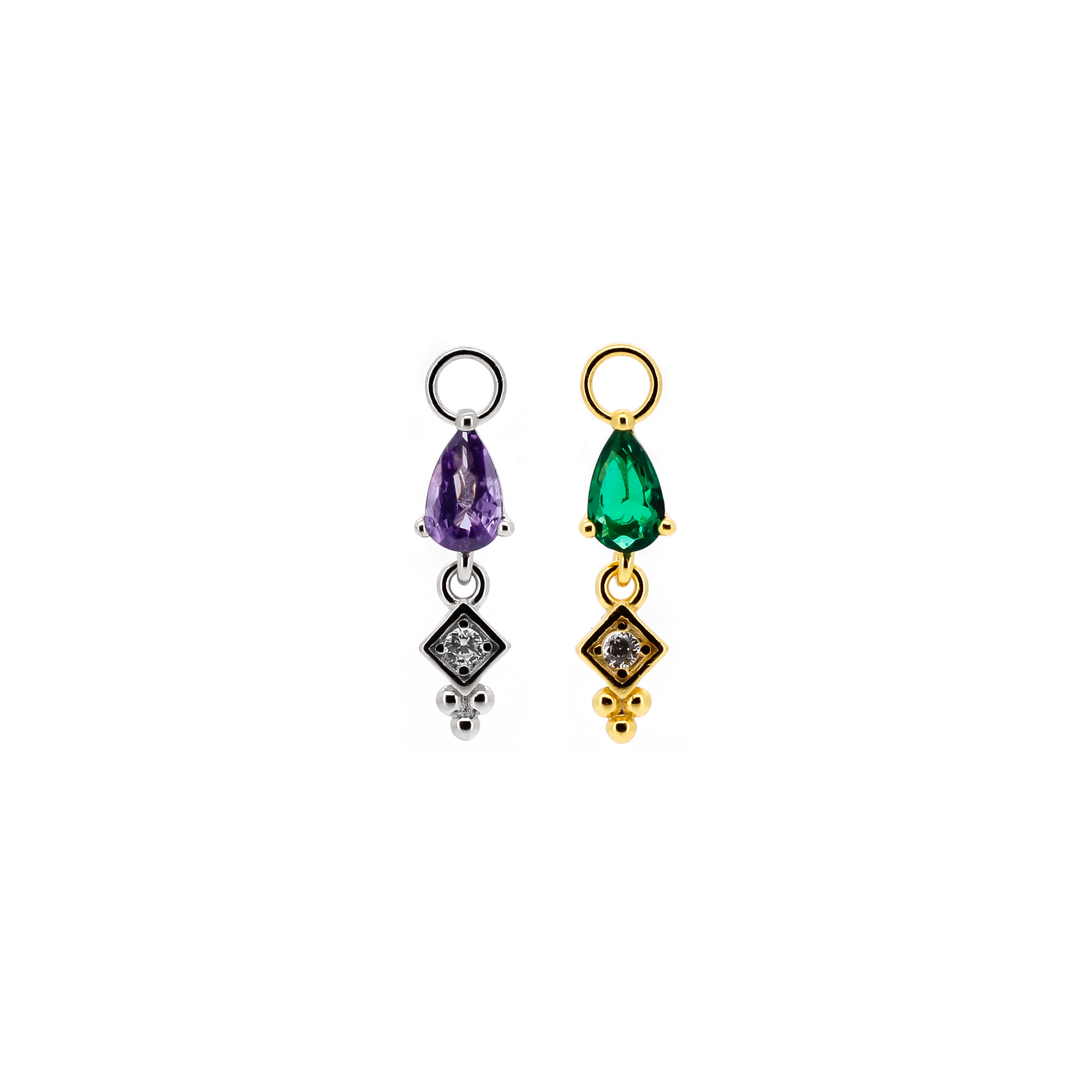 Pendente con pietra a forma di goccia colorata e zircone con occhiello di diametro 1 mm. Adatto solo a cerchietti di spessore 1 mm o inferiore.