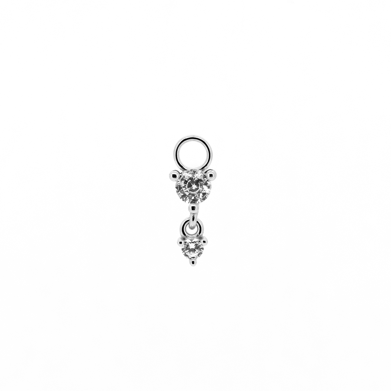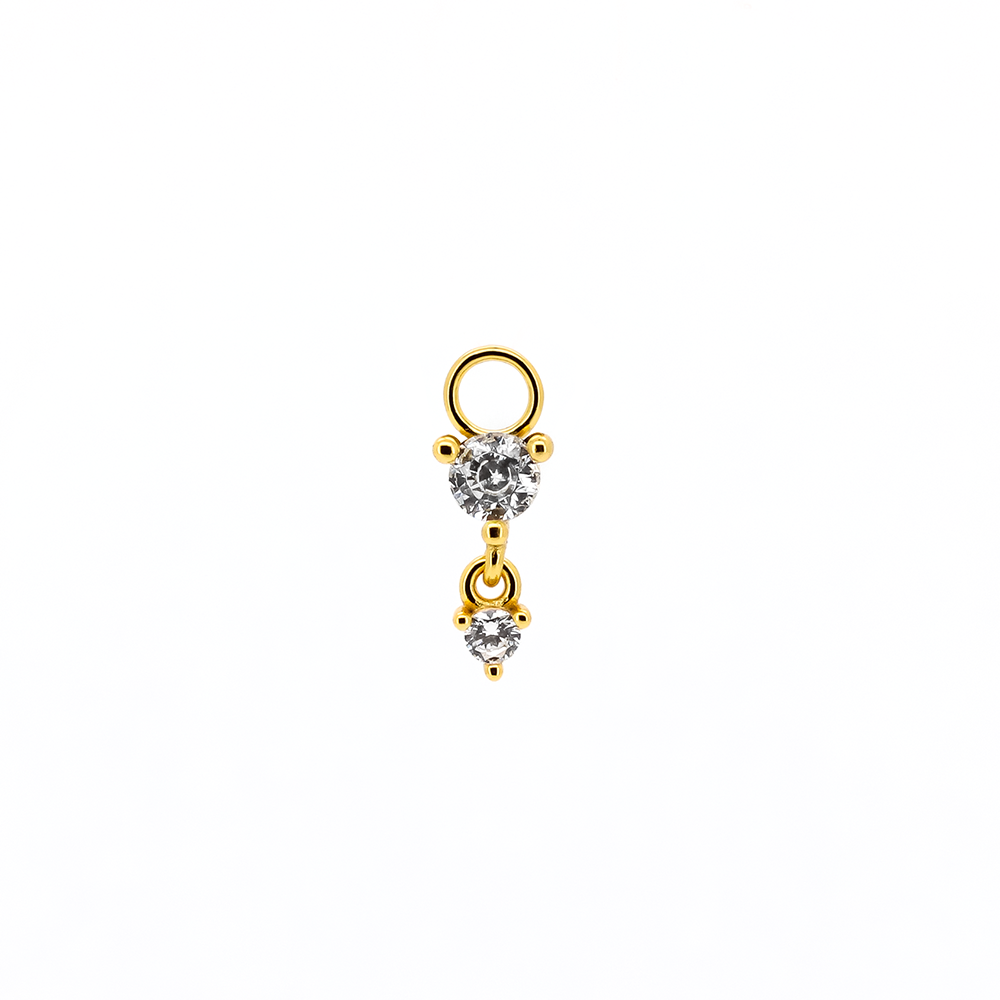 Pendente con due zirconi con occhiello di diametro 1 mm. Adatto solo a cerchietti di spessore 1 mm o inferiore.