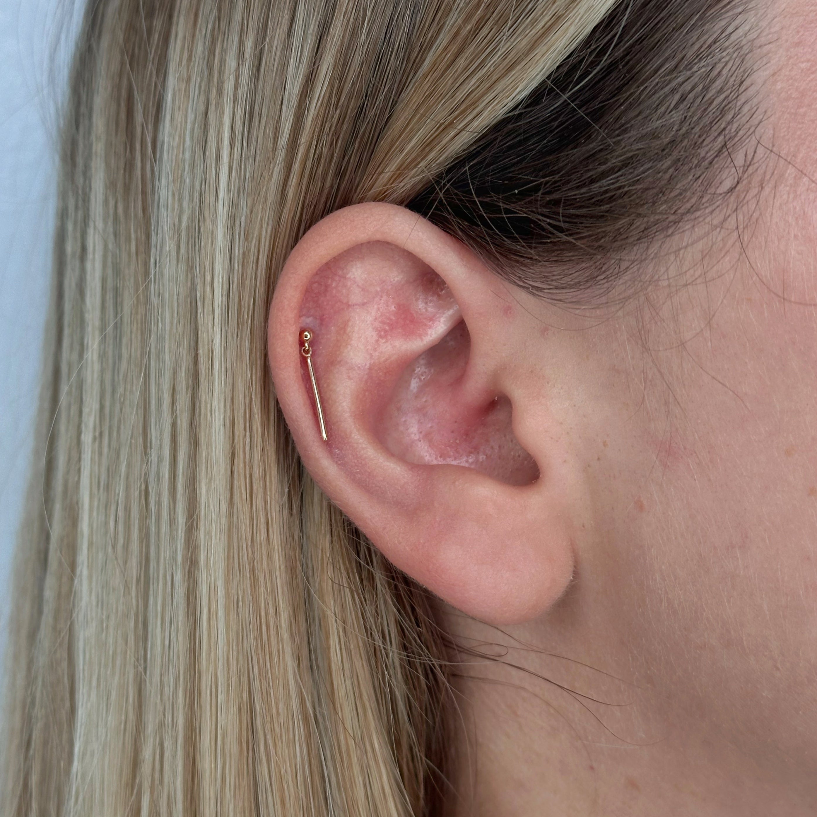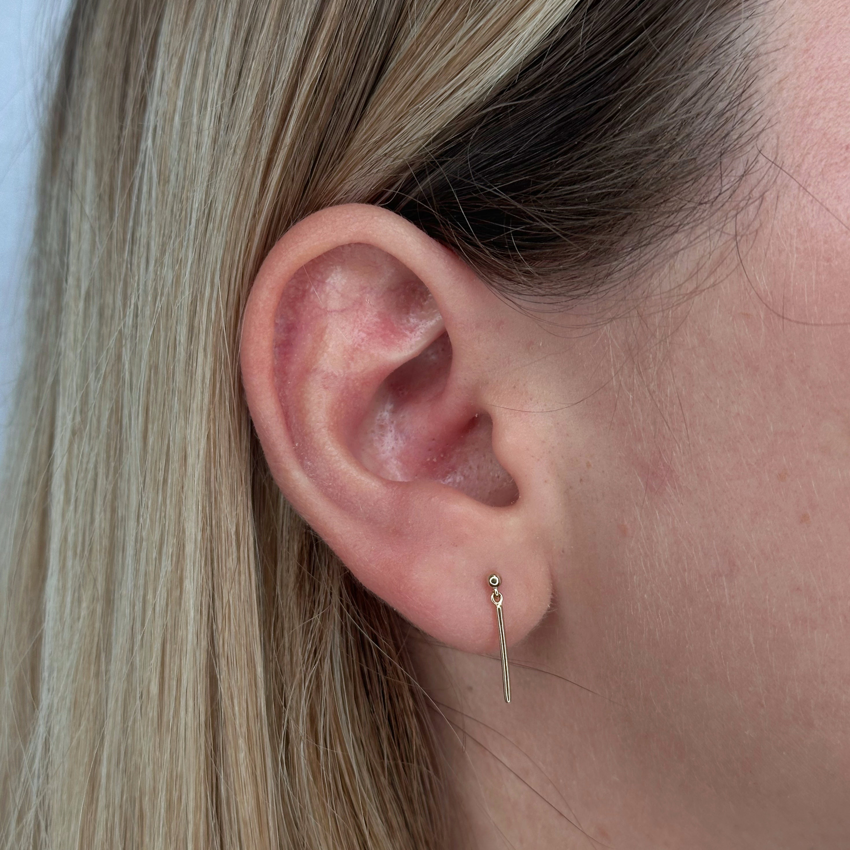 Vi presentiamo Cassi! Una perla d'oro massiccio con una delicata barra d'oro sospesa sotto di essa. Progettata pensando al movimento, la barra d'oro sospesa penzola e danza con grazia ad ogni movimento.