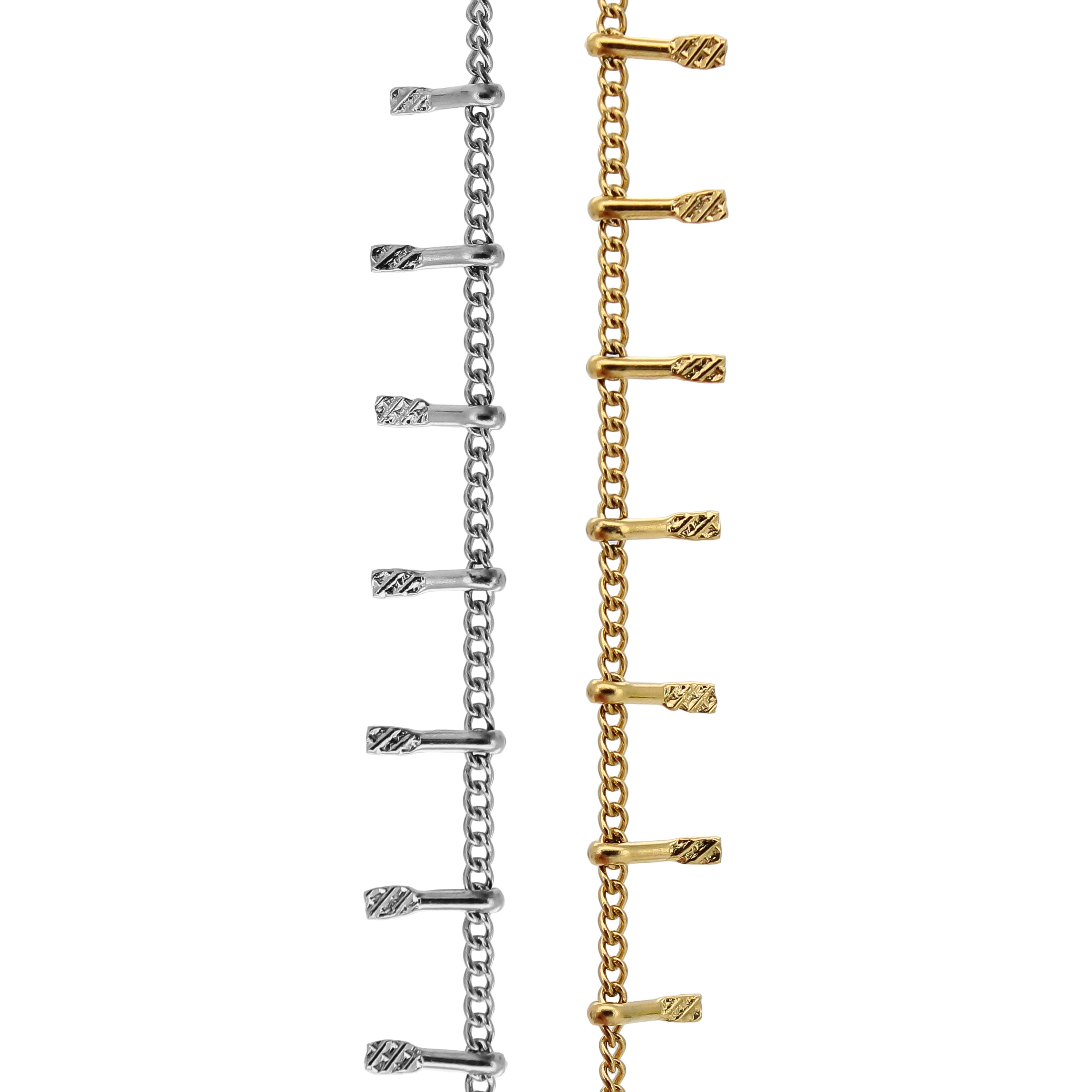 Catena in acciaio 316L composta da barrette zigrinate dal taglio deciso che si alternano a maglie di anelli intrecciati, creando un ritmo visivo unico e in continuo movimento. La sua geometria irregolare è pensata per chi ama uno stile dinamico, fluido, sempre in evoluzione.