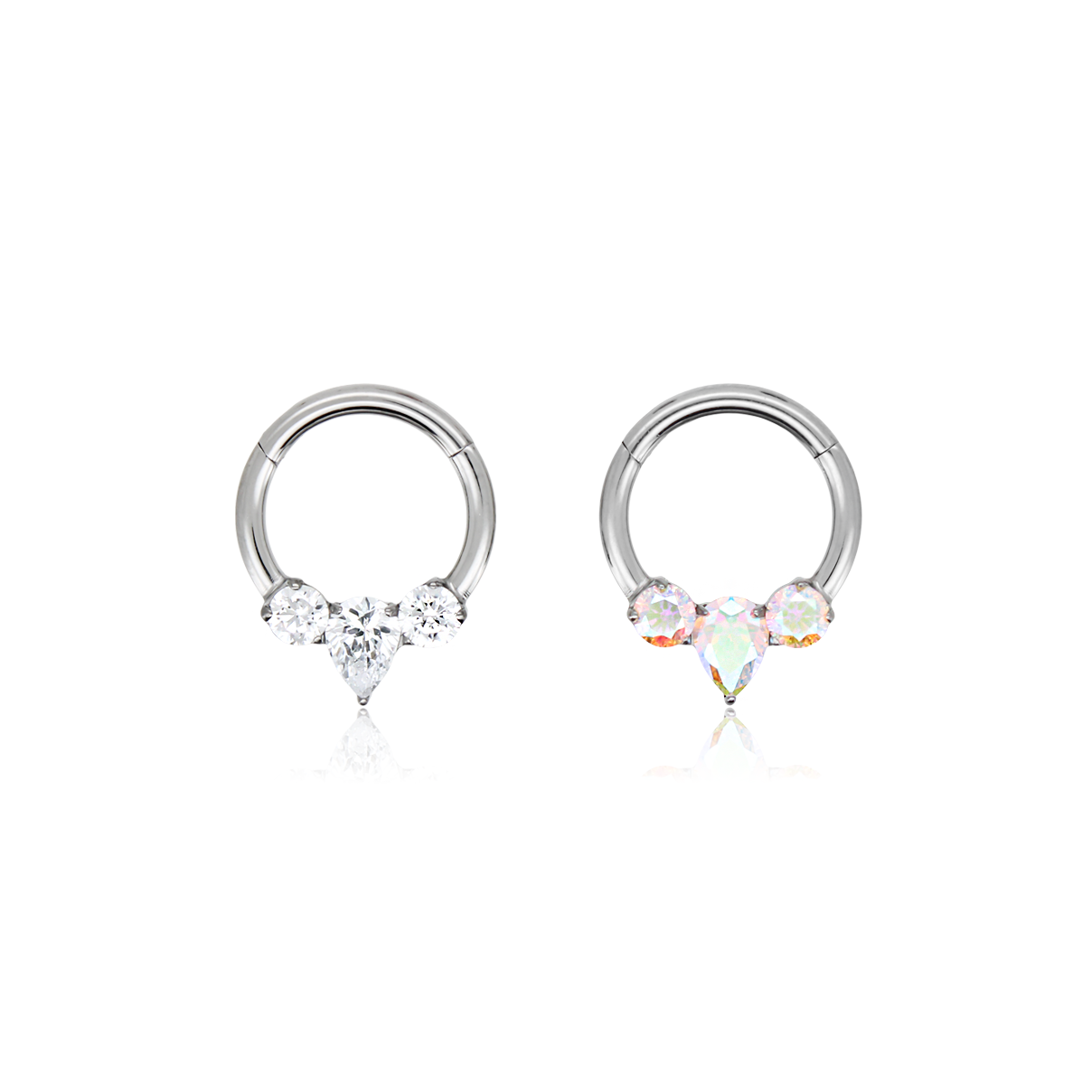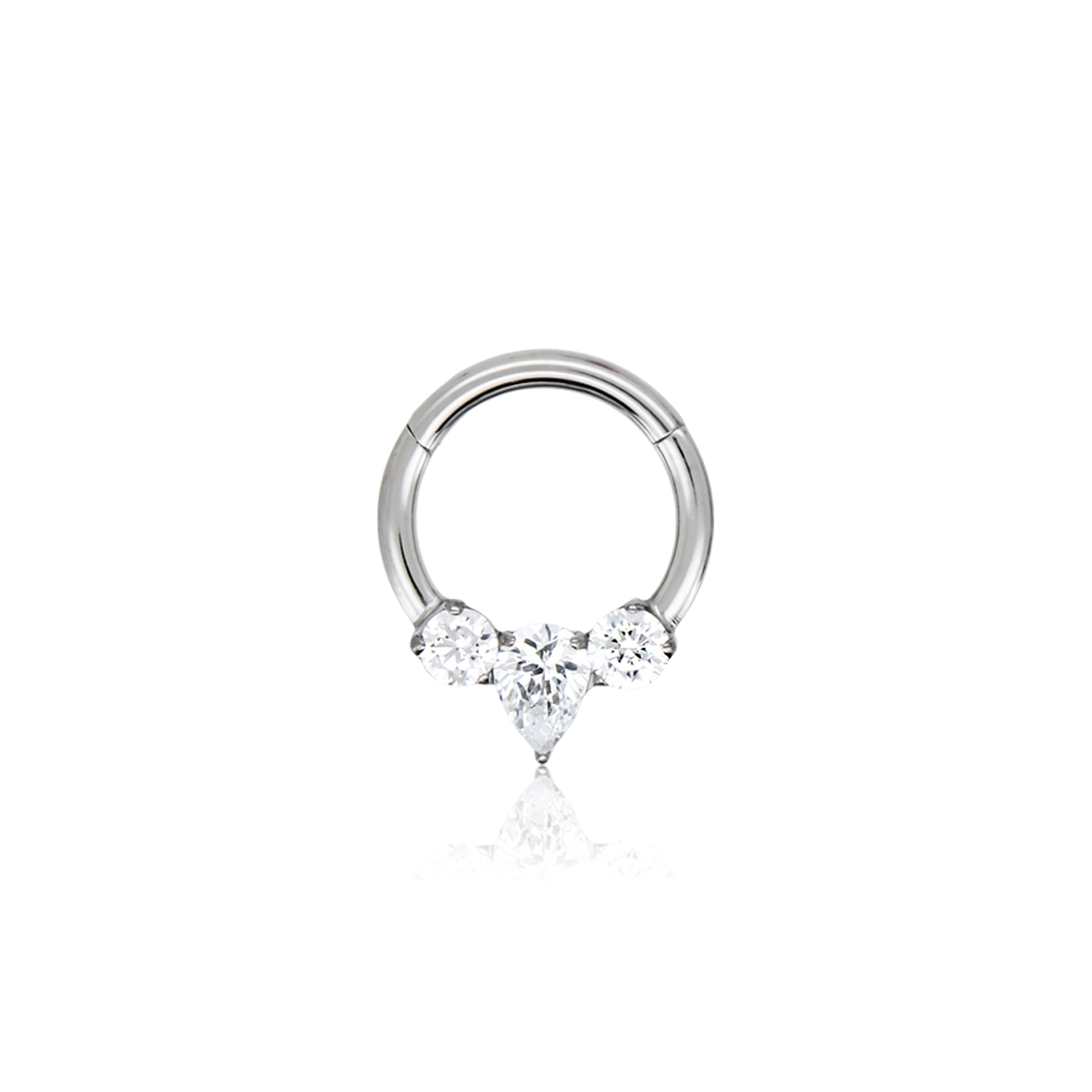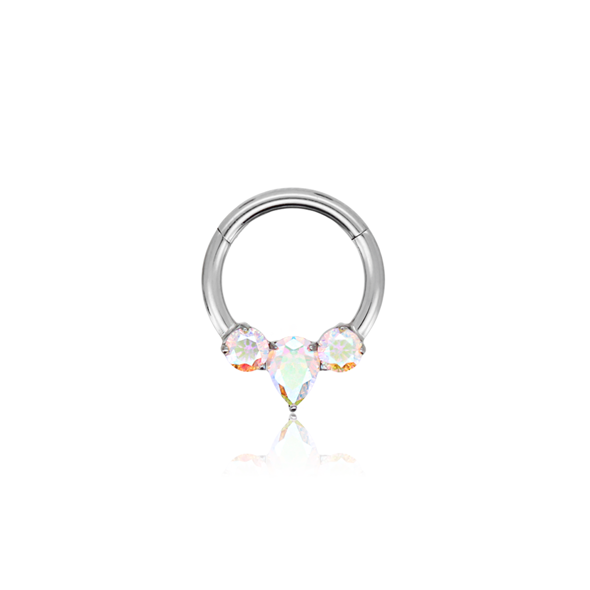 Clicker decorato frontalmente con due zirconi e una goccia cristallo centrale.