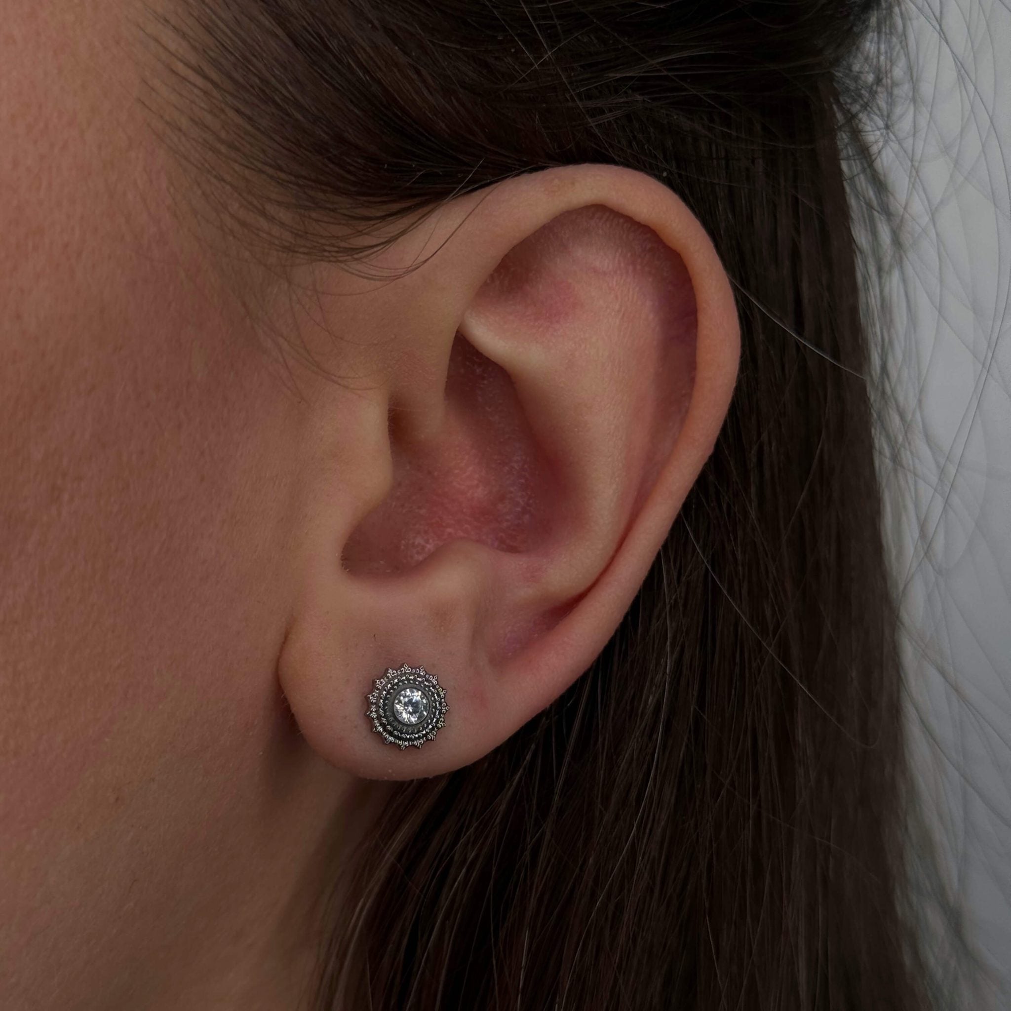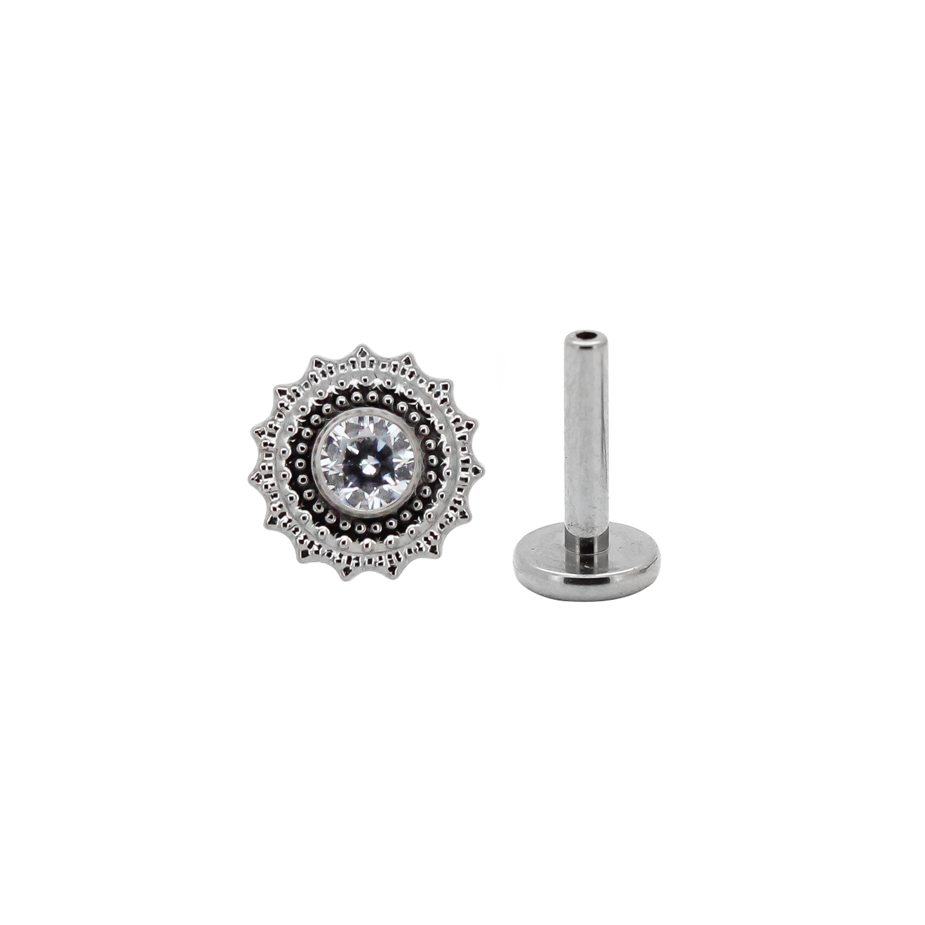 Gioiello tondo con cristallo centrale e motivo puntinato.