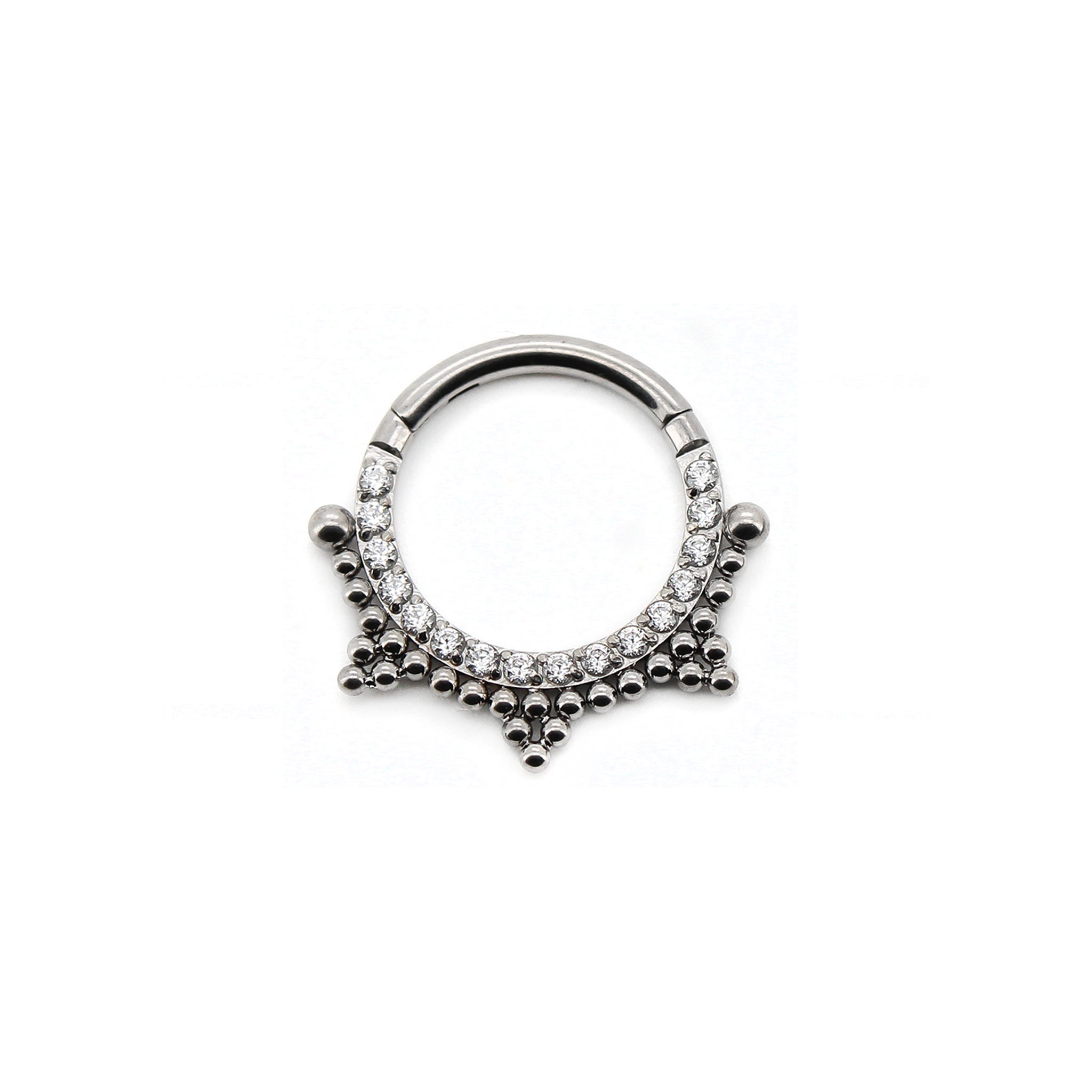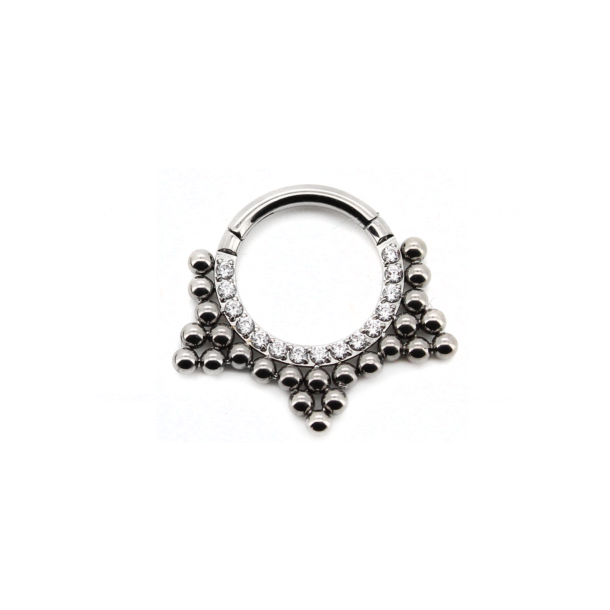 Clicker con decorazione frontale composta da una striscia di zirconi e sfere a stella.