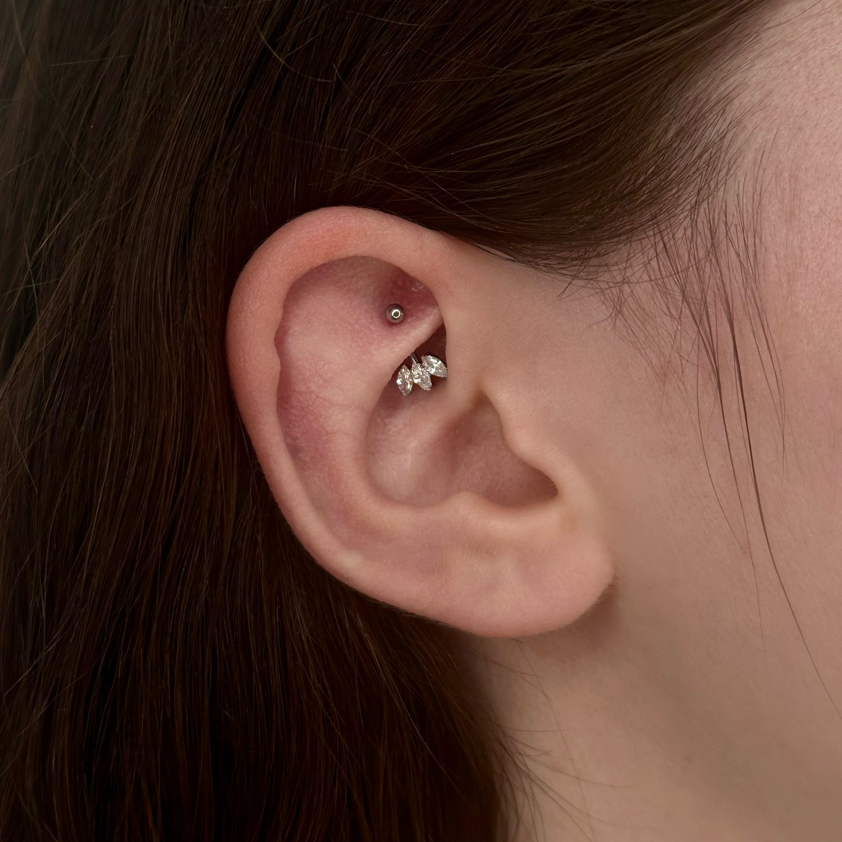 Brilla ancora di più indossando la variante con lo zircone che Sara sfoggia nella composizione. Qui abbiamo creato la combo "Vertical marquise" con la bananina su rook  + "K foliage  indossato su flat.