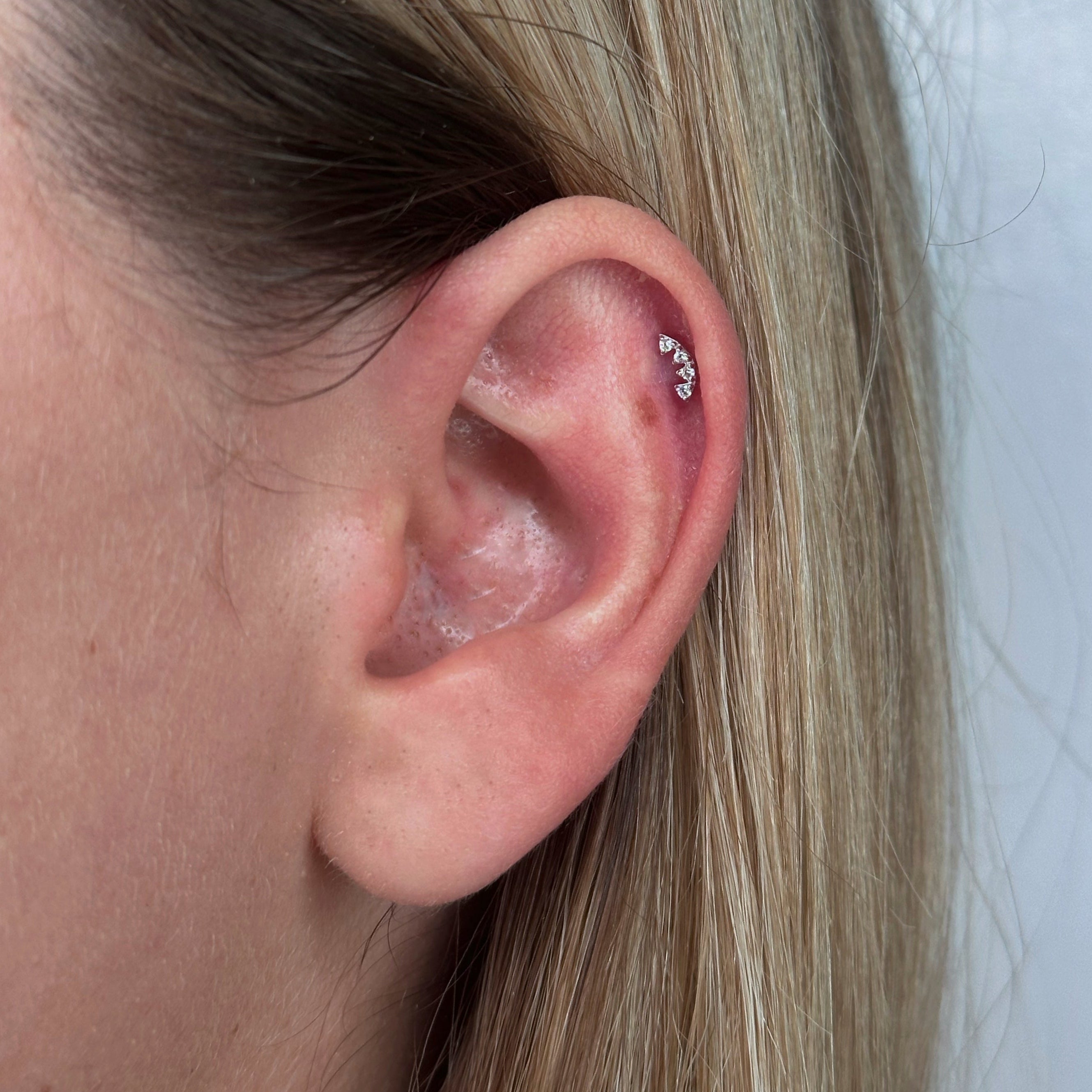 Alzati e brilla con il Wake End! Caratterizzato da un grazioso arco di scintillanti pietre CZ incastonate in eleganti impostazioni triangolari, questo pezzo completa perfettamente le curve naturali dell'orecchio. Abbinalo al nostro clicker 'Savage' per un set perfetto!