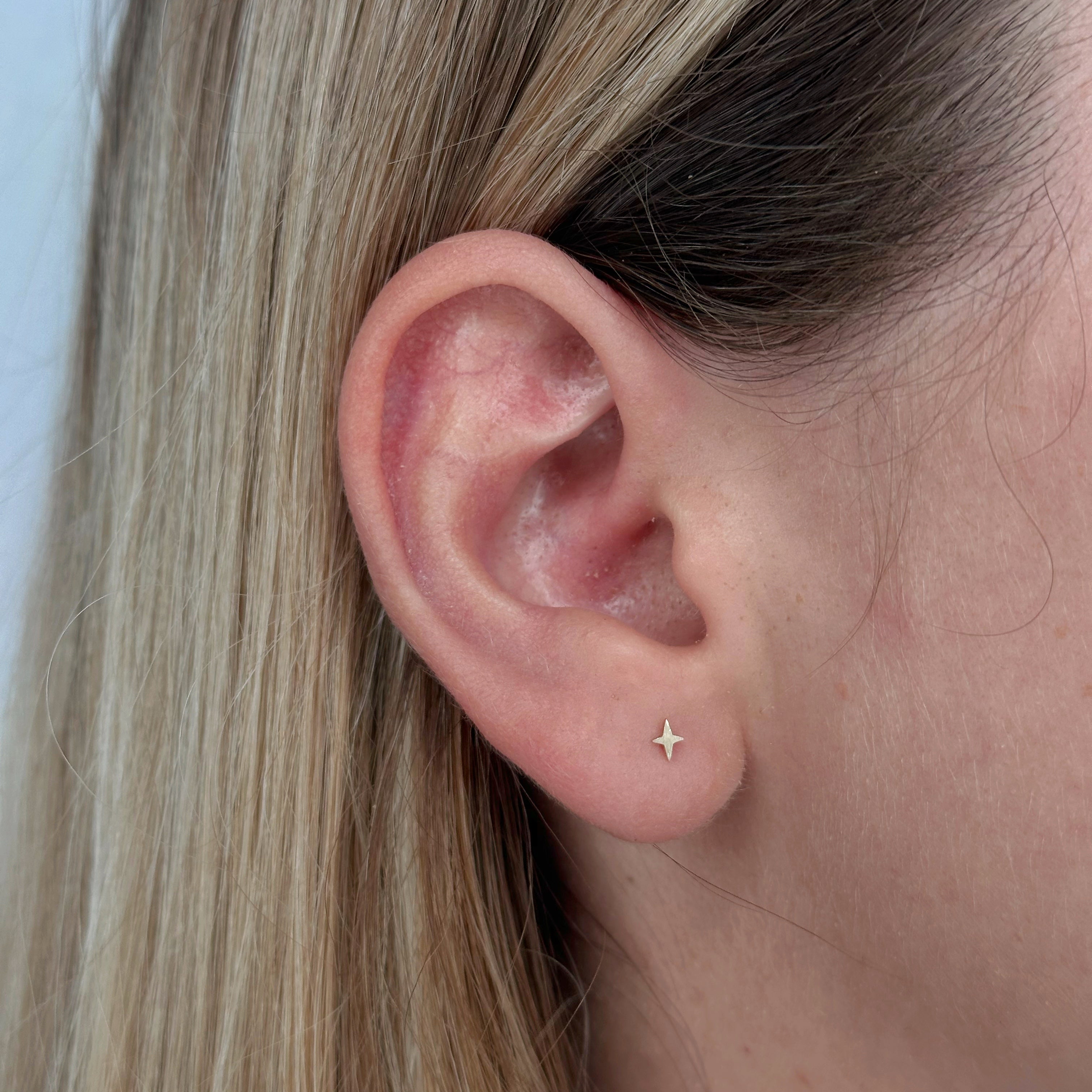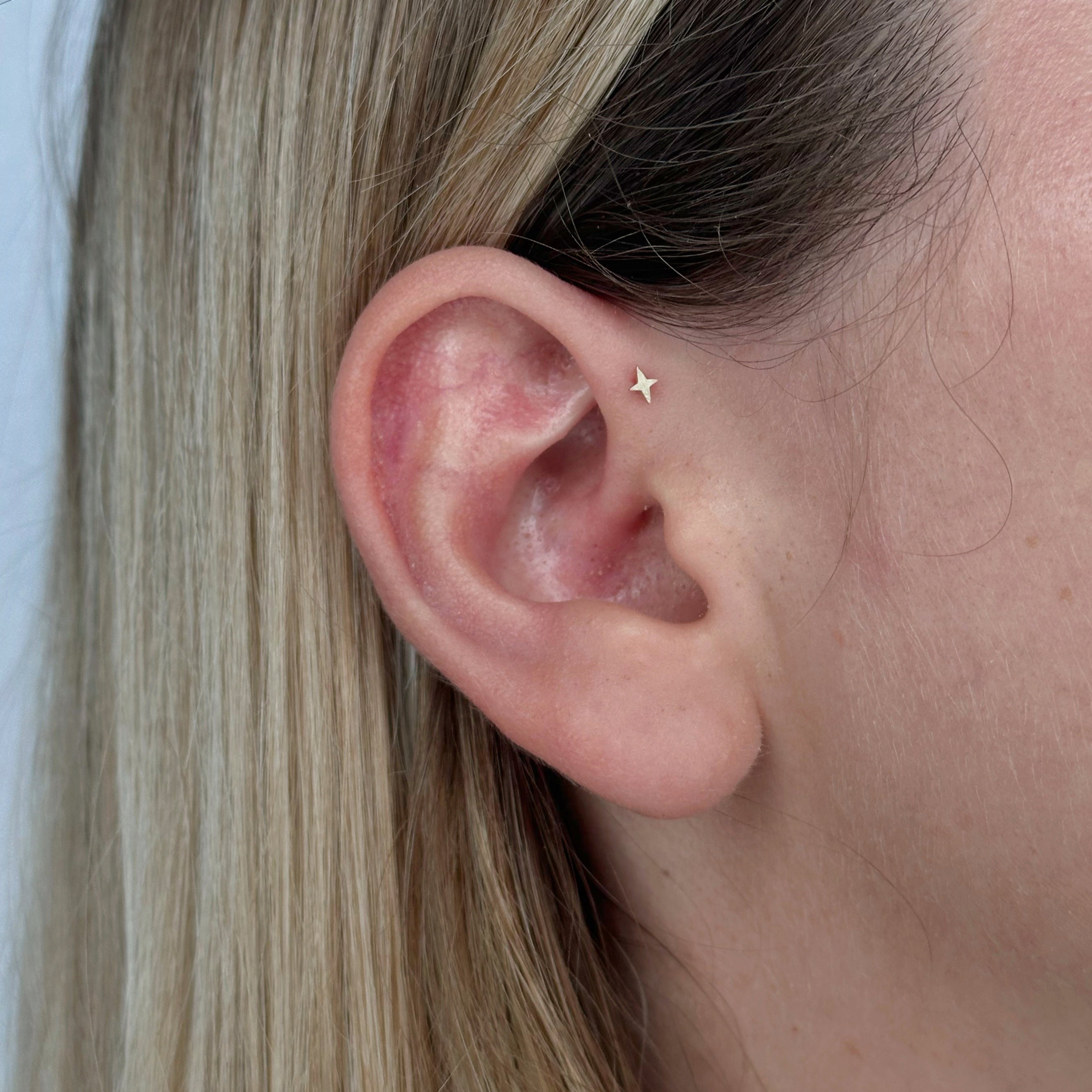 Brilla senza il flash extra! Questa stella in stile retrò a quattro punte è la controparte senza gemme della nostra estremità Divinity. Disponibile con finitura spazzolata, la sua vestibilità minimale e dal profilo basso lo rende perfetto per la maggior parte dei posizionamenti di piercing.