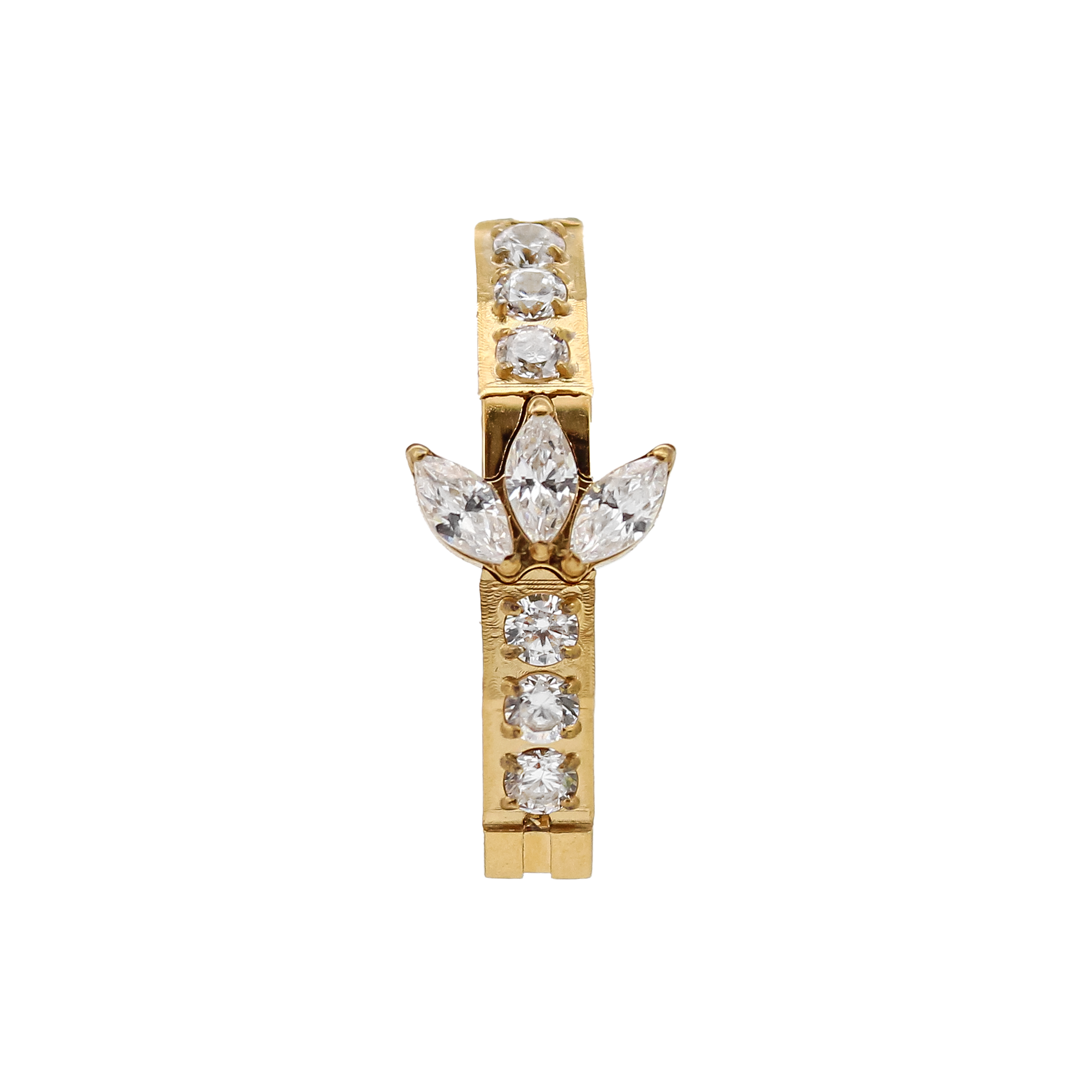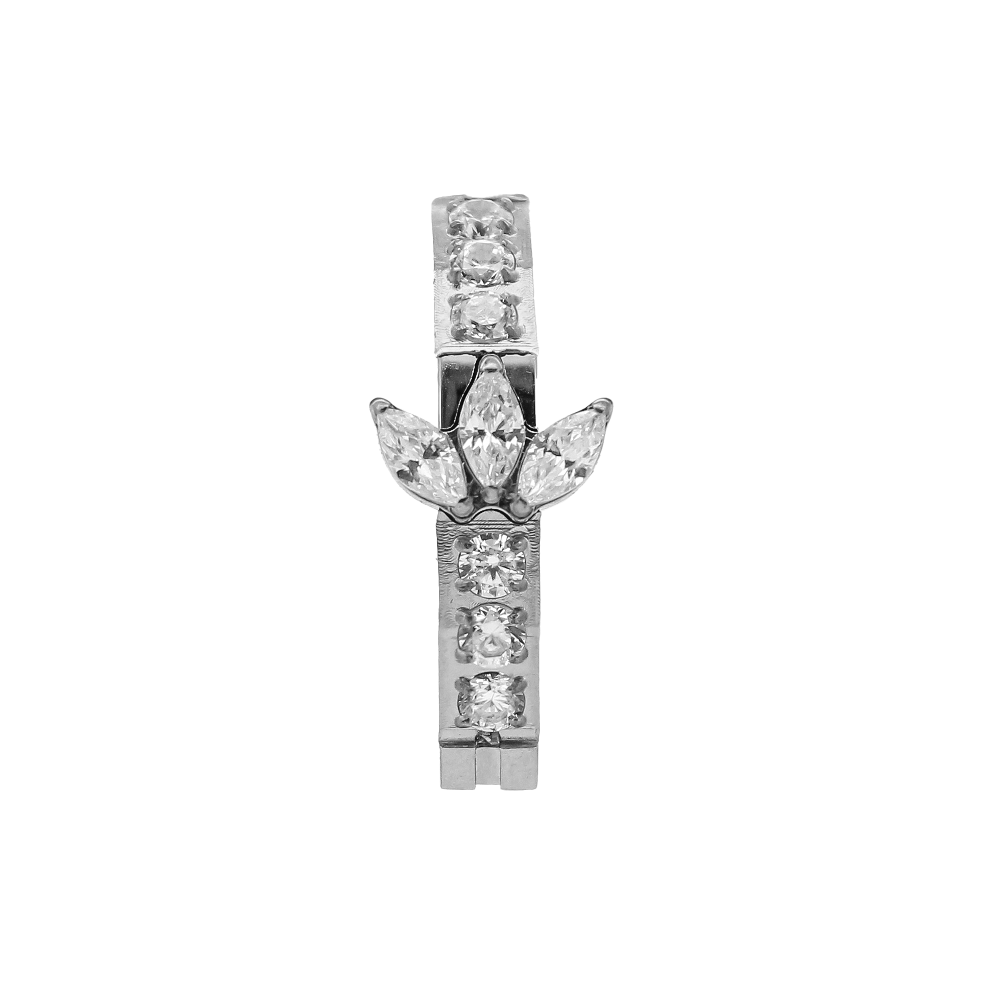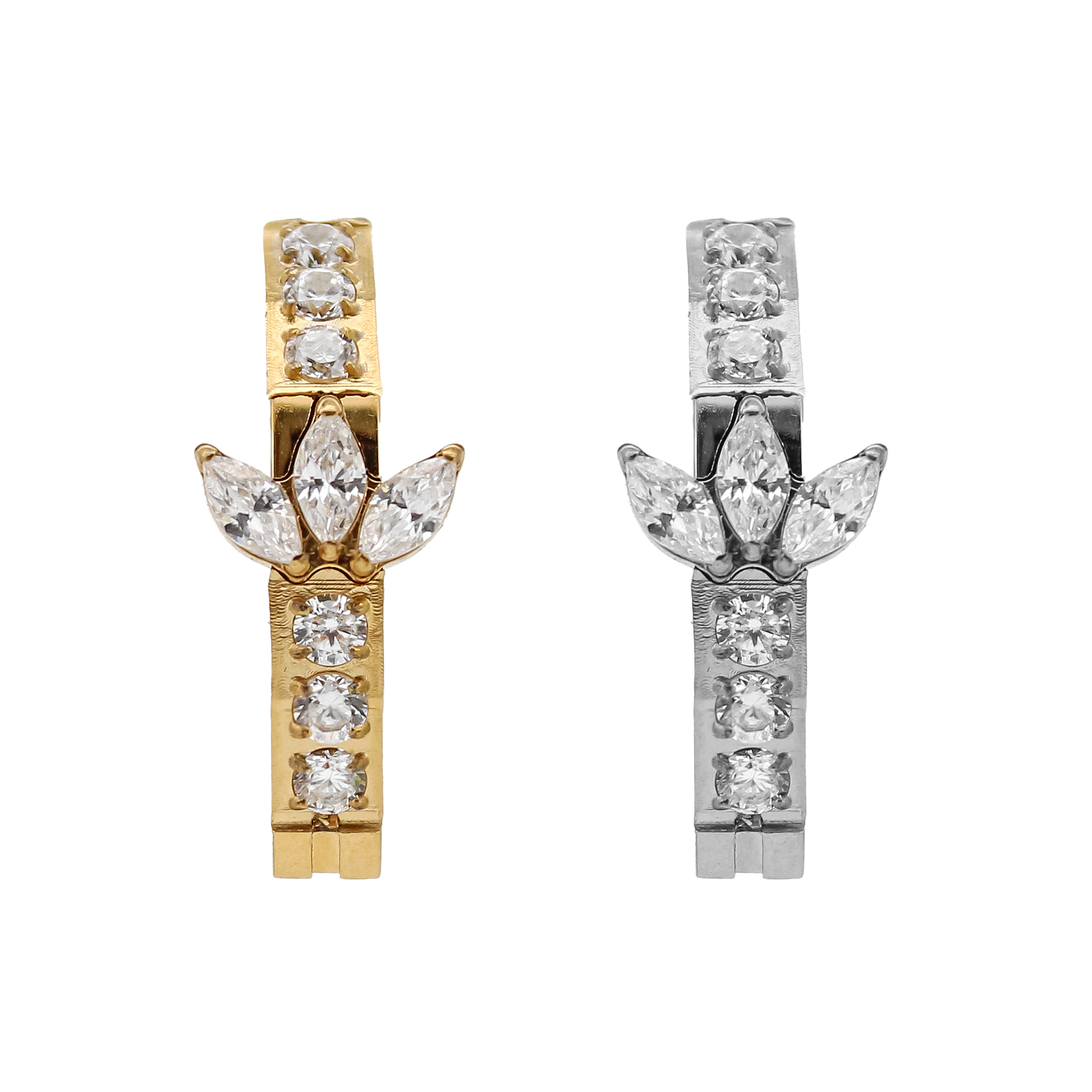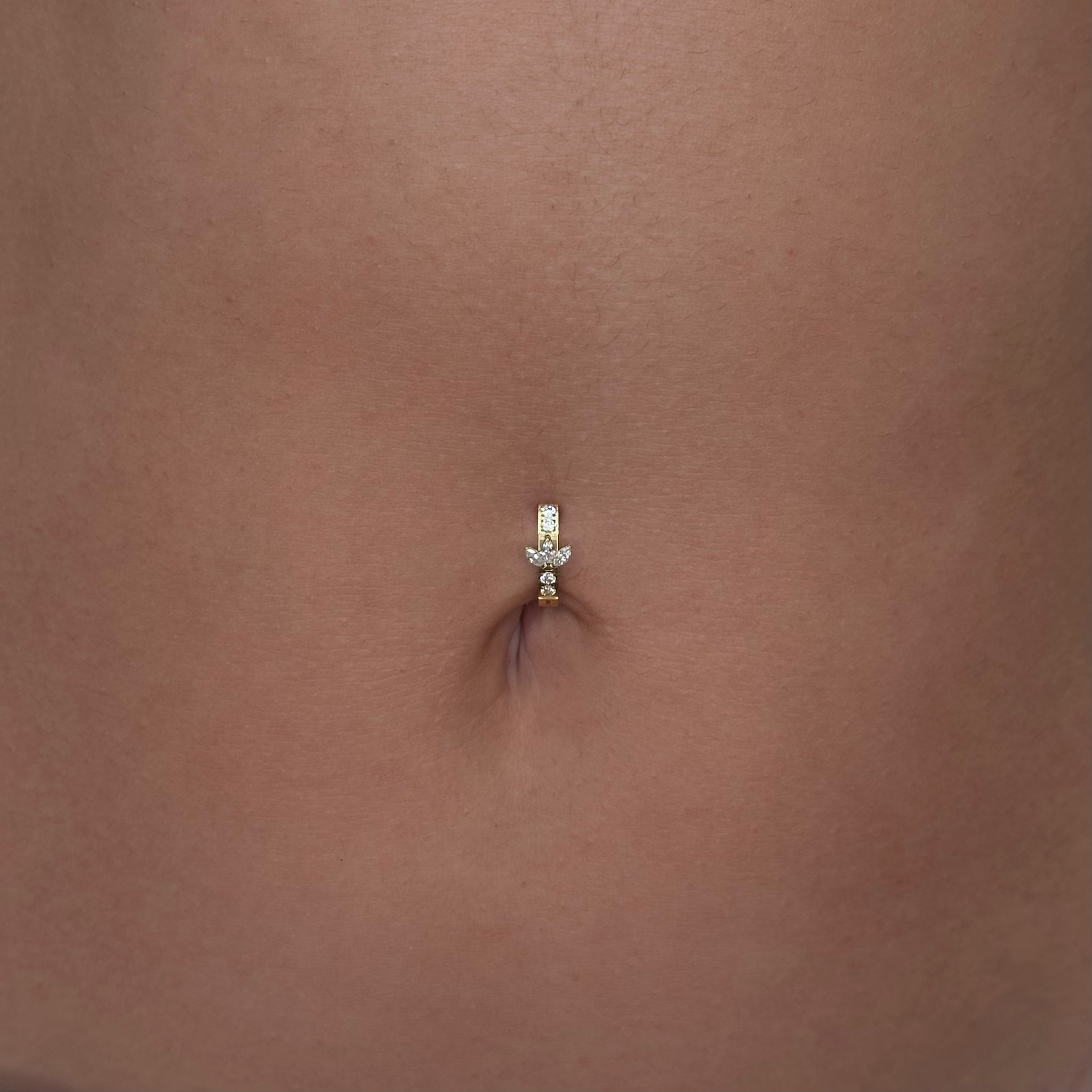 Gioiello da 1.6mm adatto a ombelico con forma ovale adornato da punti luce bianchi e una composizione a 3 marquise al centro del gioiello.